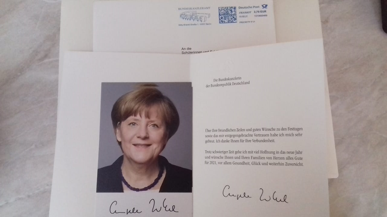 Ponadto nasi uczniowie w grudniu 2020 r. wykonali piękne kartki bożonarodzeniowe i napisali w nich świąteczne życzenia skierowane do kanclerz Niemiec Angeli Merkel. Kanclerz odpisała nam przysyłając ciepłe życzenia świąteczno-noworoczne na trudny okres pandemii.