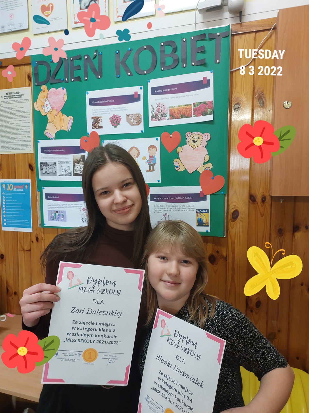 Dzis w naszej szkole wszystkie Panie małe i duże obchodziły swoje święto. O odpowiednią oprawę zadbali szkolni mężczyźni, którzy przygotowali niespodzianki dla koleżanek. Były więc kwiaty, życzenia i słodkie niespodzianki. Również chłopcy z Samorządu Uczniowskiego pamiętali o święcie. Ogłosili nam dziś wyniki głosowania na Miss Szkoły. Choć wszystkie są piękne, mądre i pomocne to dwie podbiły serca Panów 🙂 w kategorii 0-4 Tytuł Miss zdobyła Blanka z klasy IV, a Zosia z klasy VIII zwyciężyła w kategorii 5-8 😍 Gratulujemy 💐💐💐To był naprawdę radosny i miły dzień!