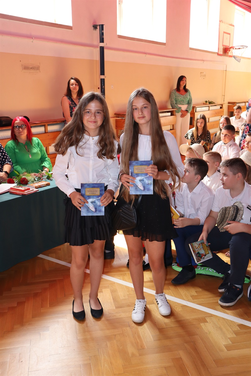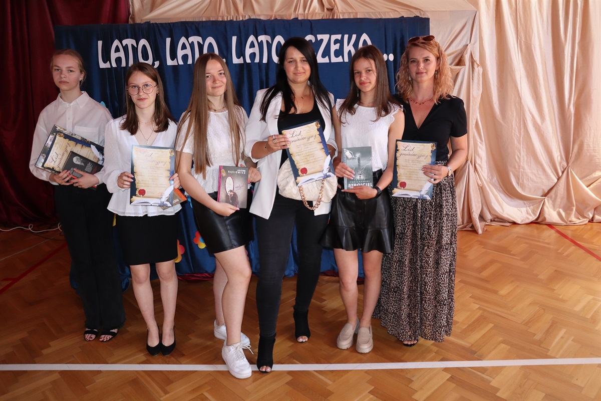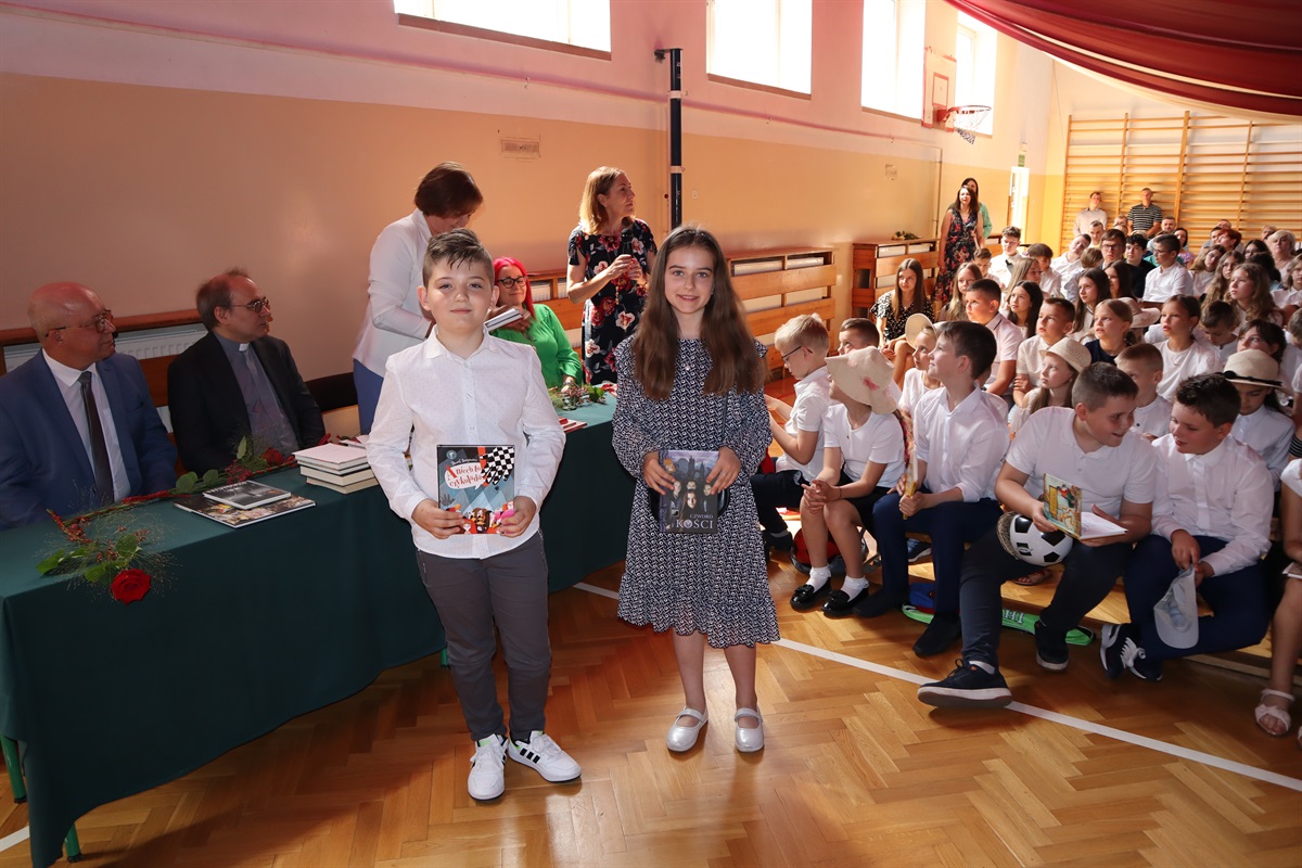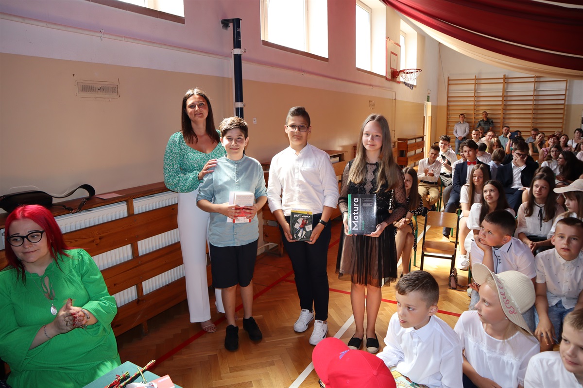 Najwięcej emocji i wzruszeń pojawiło się podczas ślubowania i nagradzania absolwentów szkoły. Nagrody za osiągnięcia w nauce otrzymali następujący ósmoklasiści: Zosia Dalewska, Weronika Dróżdż, Iza Glinka oraz Karolina Ryś. Ponadto, Izabela Glinka otrzymała nagrodę za liczne sukcesy w konkursach pozaszkolnych, a Bartosz Trojan- za aktywność i niezawodność w działaniu Samorządu Uczniowskiego. Tytuł Najlepszego Absolwenta Szkoły Podstawowej w Srocku w roku szkolnym 2021/2022 oraz jednorazowe stypendium pieniężne na zakup pomocy naukowych zdobyła Karolina Ryś. Stypendium wręczyła prezes Stowarzyszenia „Szkoła  w Srocku” Sylwia Dębska.