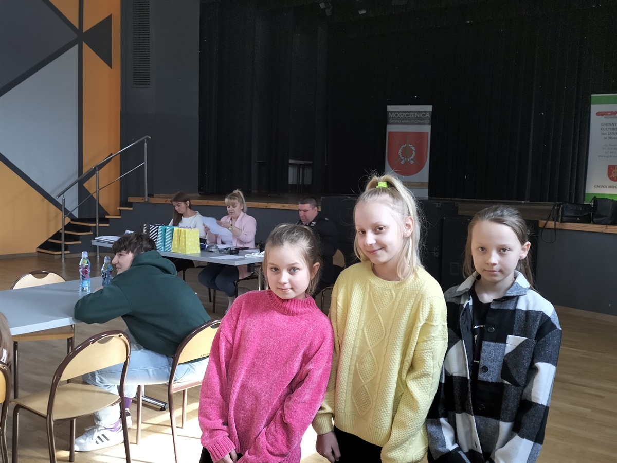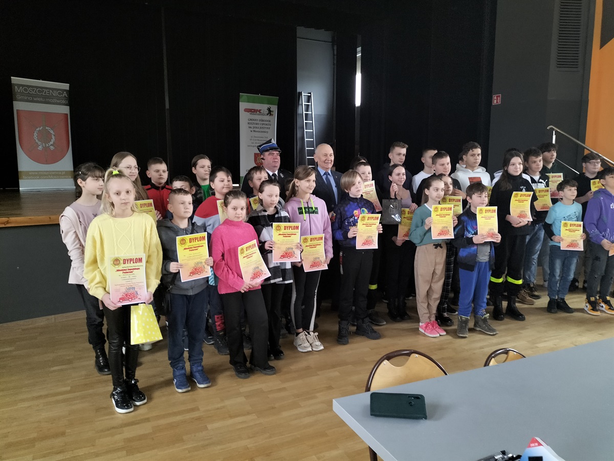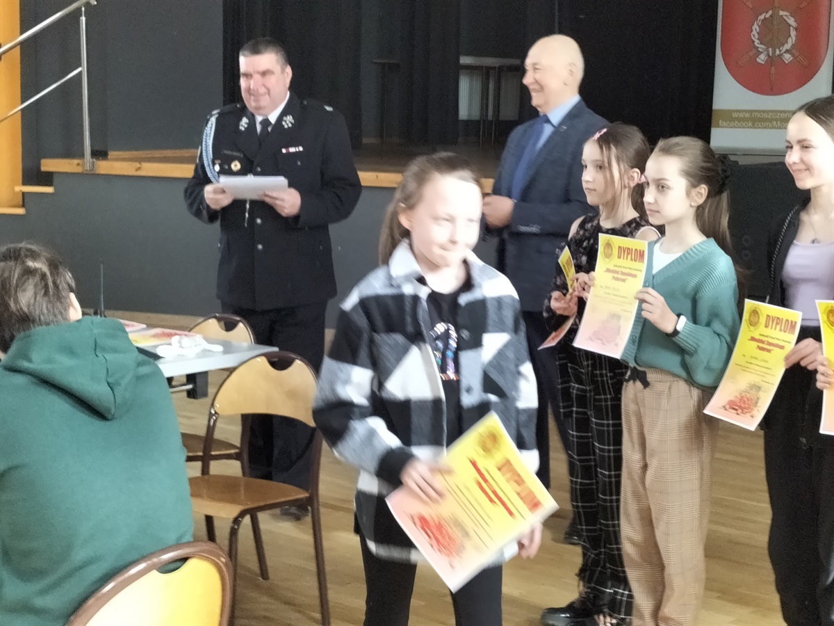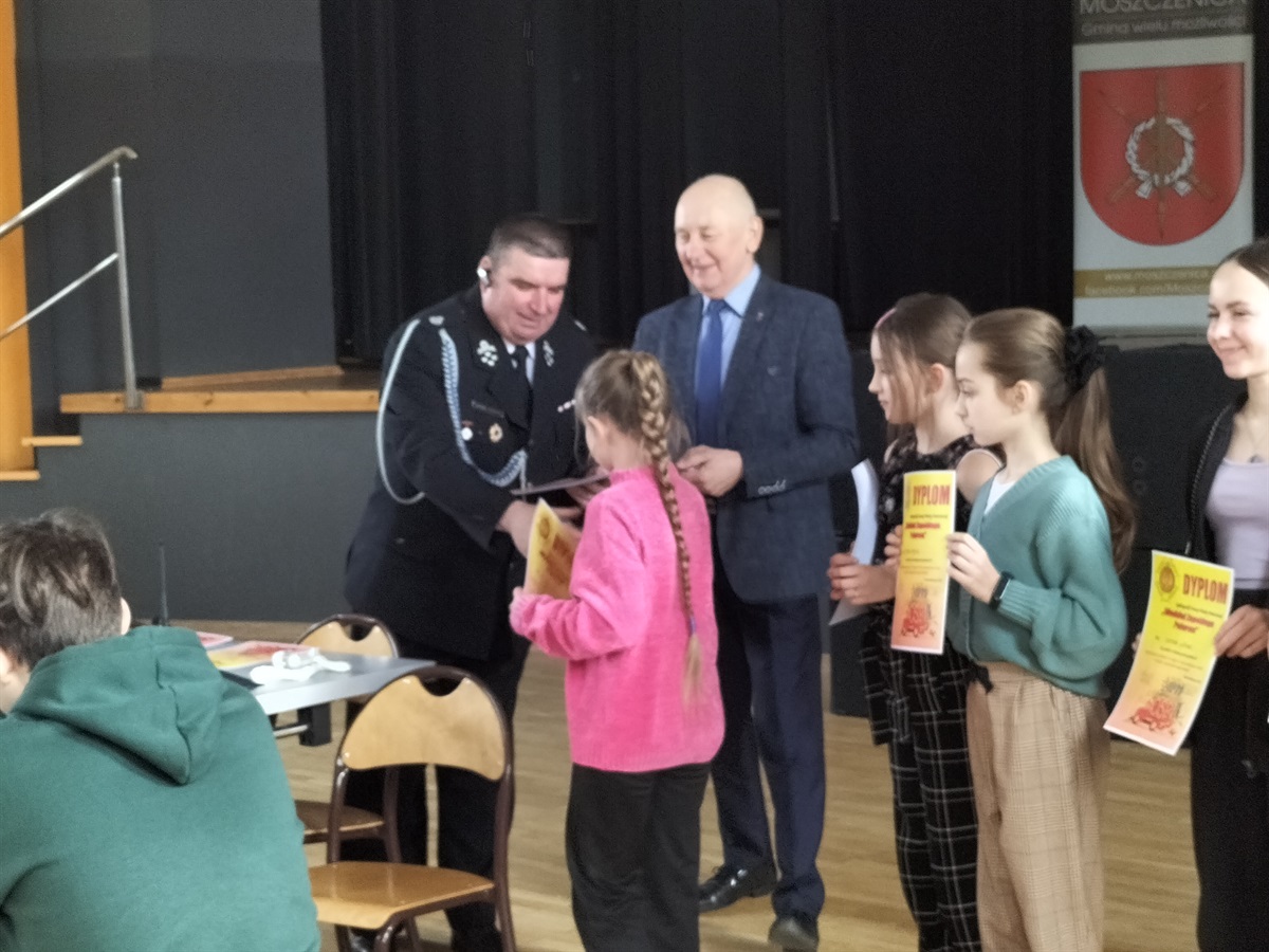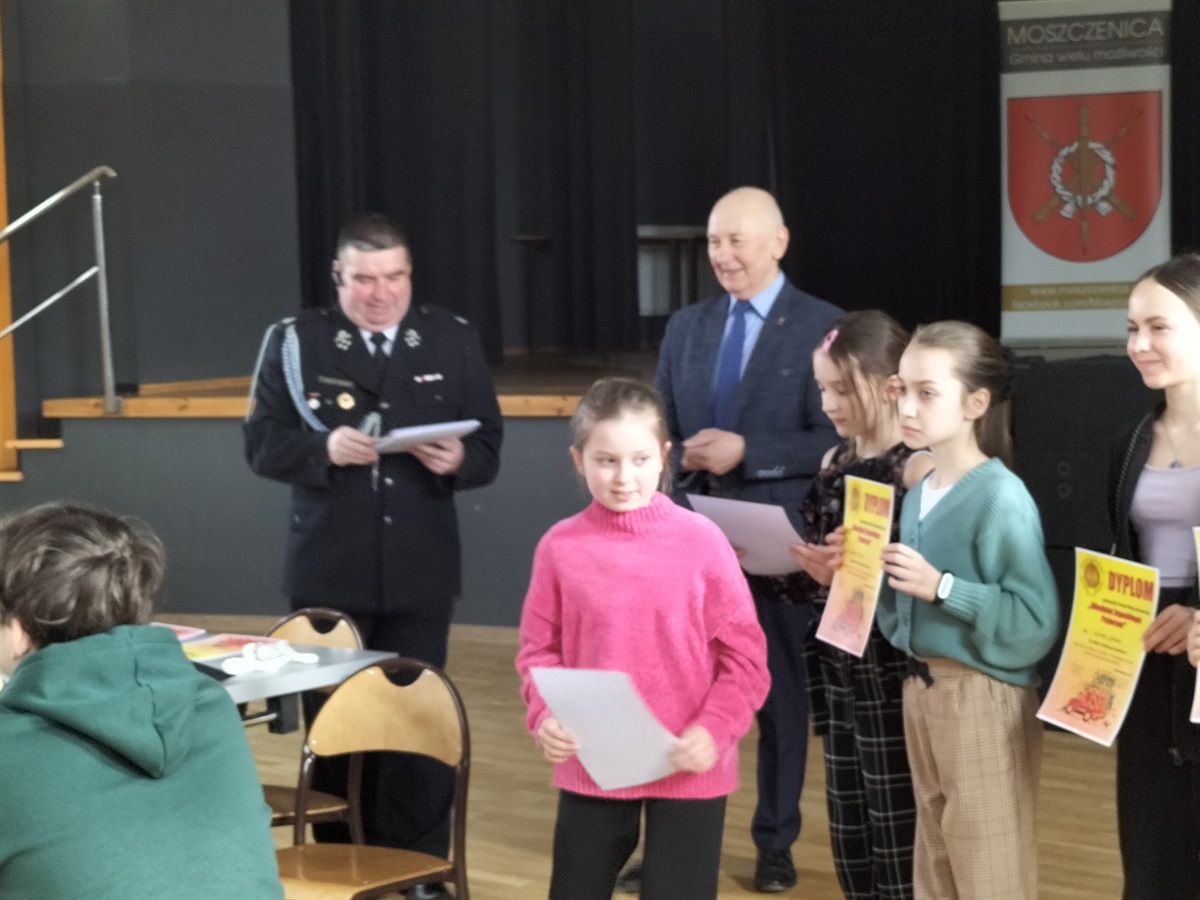 W dniu 15 marca 2023 roku,  w Gminnym Ośrodku Kultury i Sportu  Moszczenicy odbyły się Gminne Eliminacje Ogólnopolskiego Turnieju Wiedzy Pożarniczej „Młodzież Zapobiega Pożarom”. Naszą szkołę reprezentowały 3 uczennice z klasy IV: Nadia Rękar, Oliwia Stoś oraz Lena Strzelecka . Rywalizacja była bardzo wyrównana. Miło nam poinformować, że Nadia Rękar, w grupie wiekowej młodszej (klasy I-IV), zajęła 3. miejsce. Eliminacje przygotowane zostały przez pracownice Urzędu Gminy  Moszczenicy p. Ewelinę Ostrowską i Annę Niepsuj oraz Prezesa Zarządu Oddziału Gminnego Związku OSP RP w Moszczenicy p. Andrzeja Dróżdża. Nagrody wręczał Wójt Gminy p. Marceli Piekarek. Wszystkim uczestnikom gratulujemy wiedzy, a Nadii i jej koleżankom- życzymy sukcesów w przyszłych edycjach turnieju.