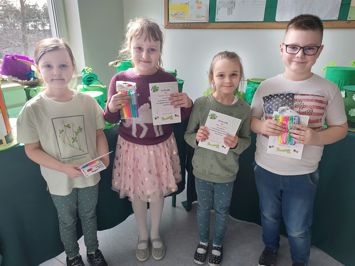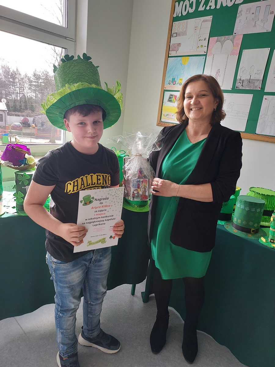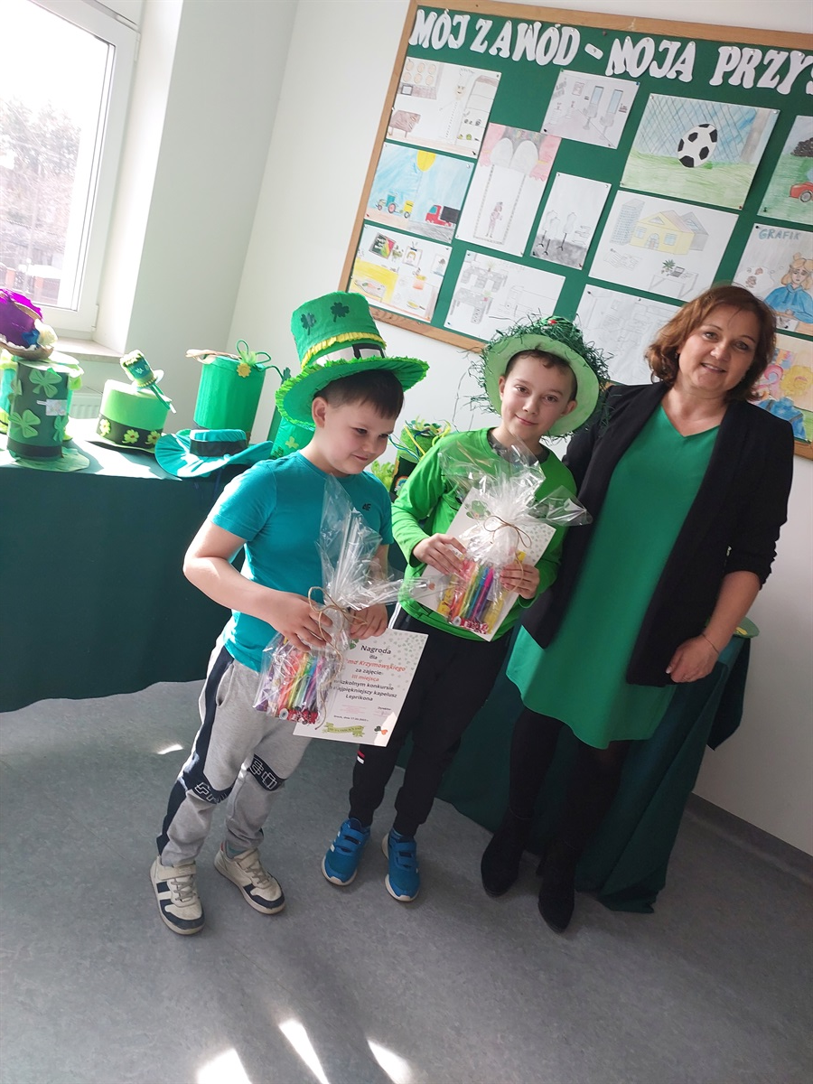 Dziś uczniowie naszej szkoły poznawali tradycje, historię i geografię Szmaragdowej Wyspy - Irlandii. Dzięki staraniom kolegów i koleżanek z klasy 7 i 8, uczniowie obejrzeli prezentacje o Irlandii, poznali legendę o Leprikonach i garnku złota. Poznawali też symbole i postać Świętego Patryka oraz rozwiązywali interaktywny quiz. W całej szkole pojawiły się dekoracje związane z symbolami Irlandii. Na koniec podano wyniki konkursu na najpiękniejszy kapelusz Leprikona. Oj... jury miało trudne zadanie, bo kapelusze były po prostu śliczne. Wielkie brawa dla wszystkich uczestników za zaangażowanie. Ostatecznie, I miejsce zajął Artur Kilon z klasy IV, II miejsce- Oliwia Sochacka z klasy III, a  III miejsce- Adam Krzymowski z oddziału przedszkolnego i Oliwier Badek z klasy IV.  Gratulujemy zwycięzcom, a Radzie Rodziców dziękujemy za ufundowanie nagród. Wszystkie kapelusze można podziwiać na górnym korytarzu, a więcej zdjęć z tego dnia znajdziecie na naszym szkolnym fb.