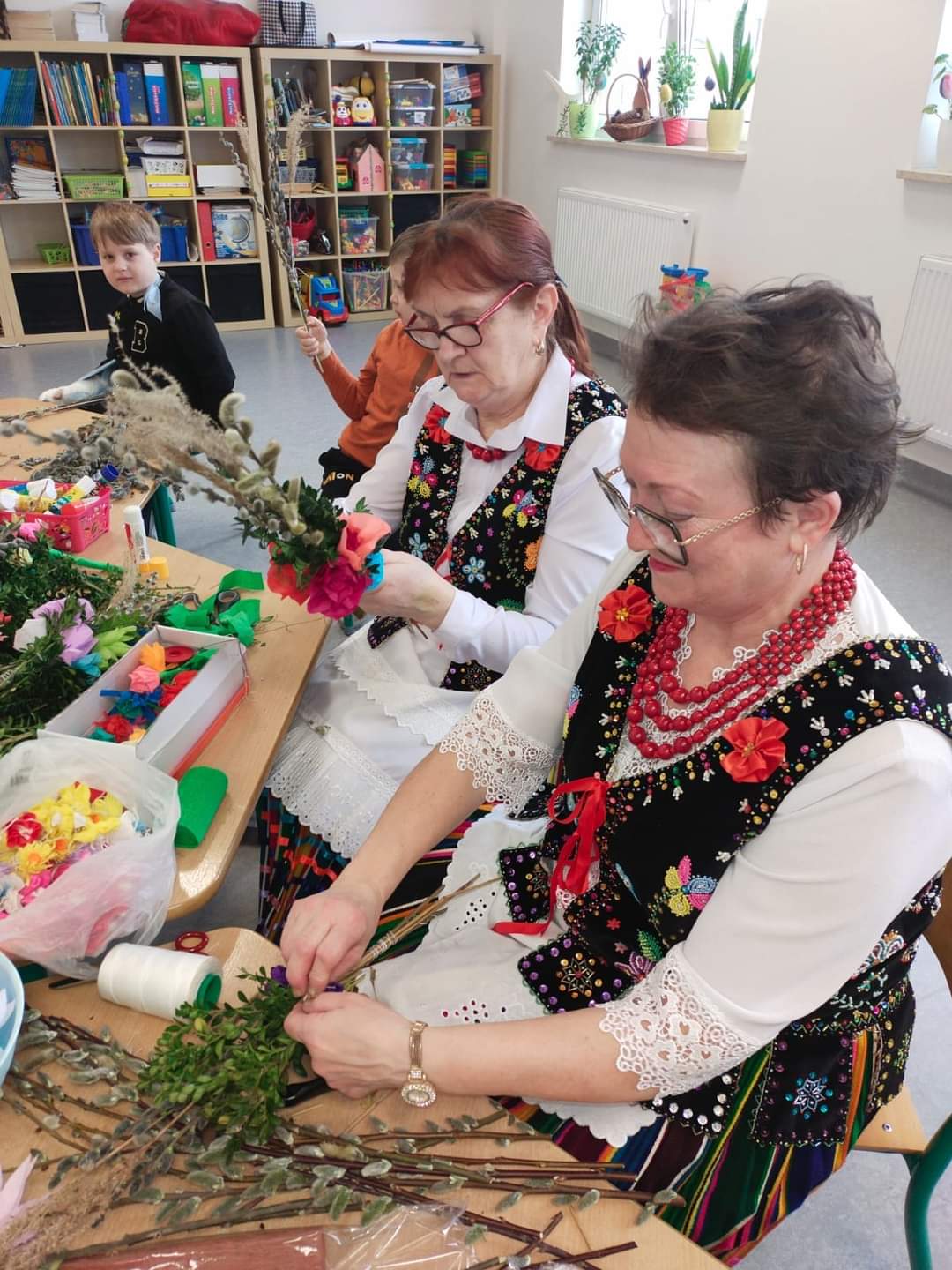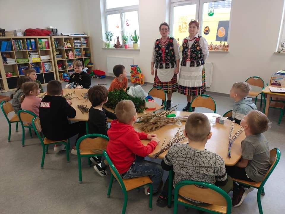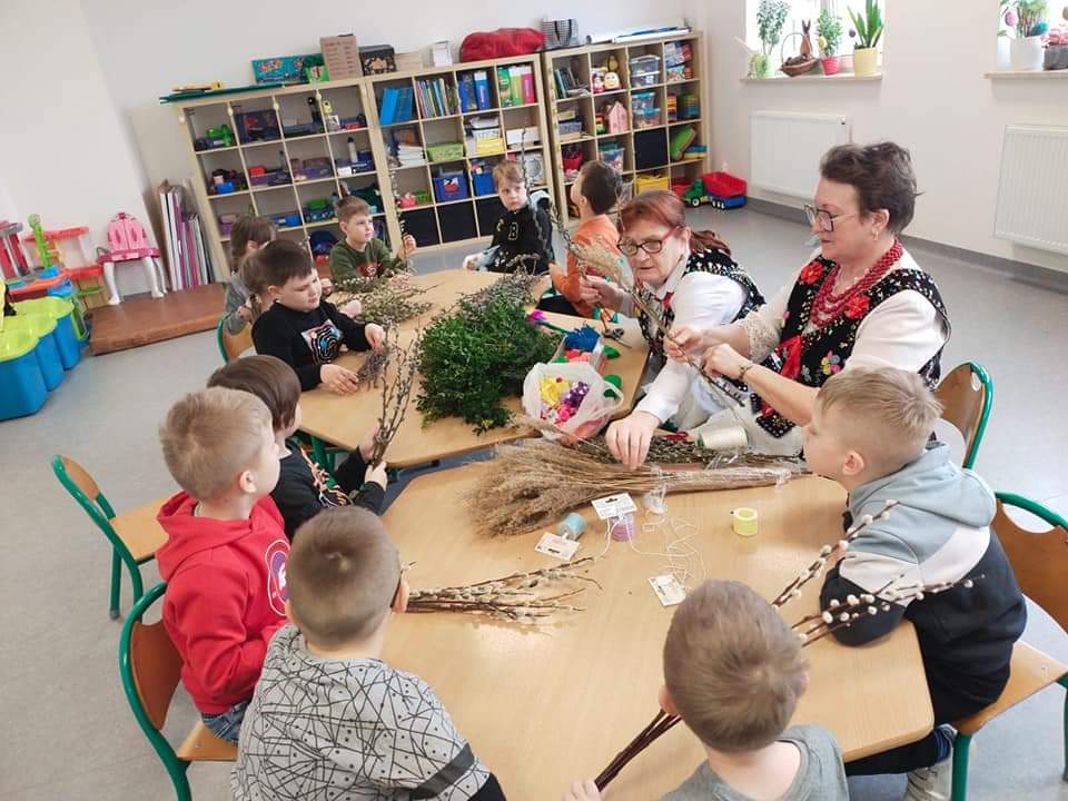 Na zaproszenie dzieci z oddziału przedszkolnego i ich wychowawczyni, naszą szkołę odwiedziły członkinie Koła Gospodyń Wiejskich w Srocku. Panie, ubrane w piękne stroje ludowe, prezentowały sposoby wykonywania tradycyjnych palm wielkanocnych.