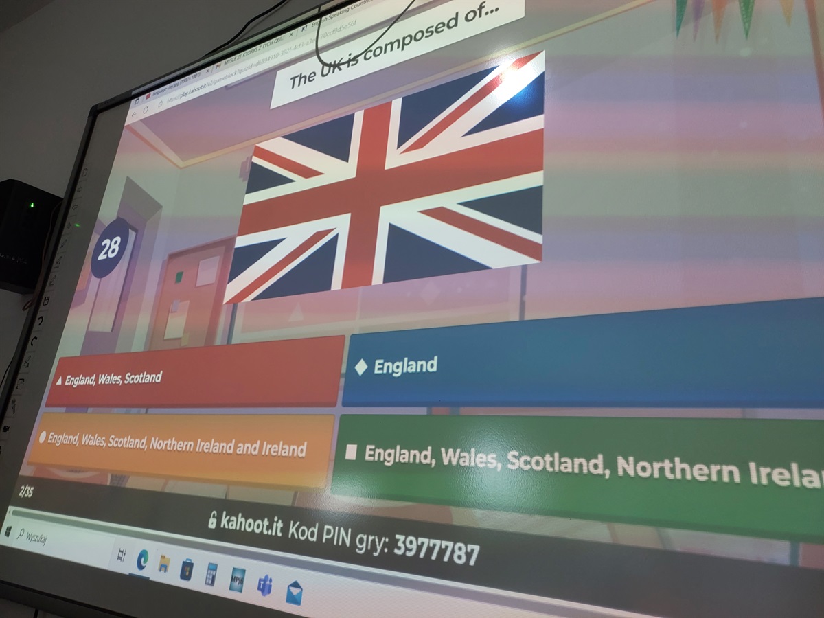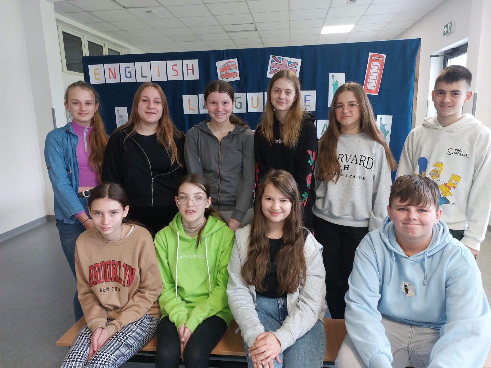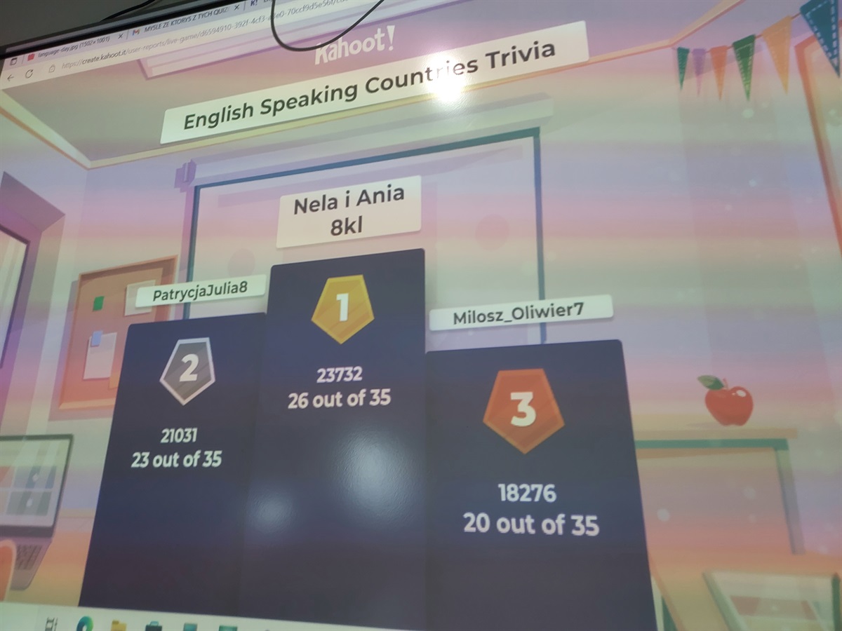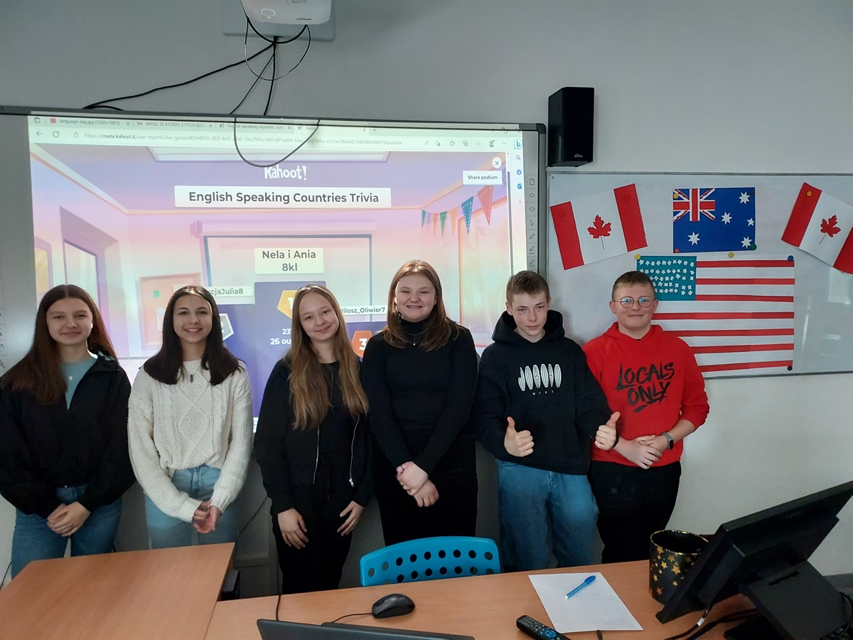 Z tej okazji w naszej szkole odbyły się wyjątkowe lekcje języka angielskiego.  Klasy I - III przygotowały flagi krajów anglojęzycznych, a starsi uczniowie brali udział w grach, zabawach i quizach językowych. W międzyklasowych rozgrywkach Kahoot pierwsze miejsce zajęły Kornelia i Ania z klasy VIII,  miejsce drugie Patrycja i Julia również z klasy VIII a trzecie miejsce na podium wywalczyli Miłosz i Oliwier z klasy VII.  GRATULUJEMY