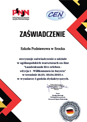 W bieżącym roku szkolnym chętni uczniowie klas 6-8 mieli okazję uczestniczyć w pierwszej edycji Ogólnopolskich Warsztatów "Landeskunde live erleben - Willkommen in Bayern."  Organizatorem przedsięwzięcia był Zarząd Główny PSNJN we współpracy z Centrum Edukacji Nauczycieli w Łomży, natomiast partnerem projektu była szkoła językowa „Los geht’s” z Monachium. Podczas warsztatów uczniowie mogli poznać dialekt bawarski oraz poszerzyć swoją wiedzę na temat kultury, historii i geografii tego alpejskiego regionu.