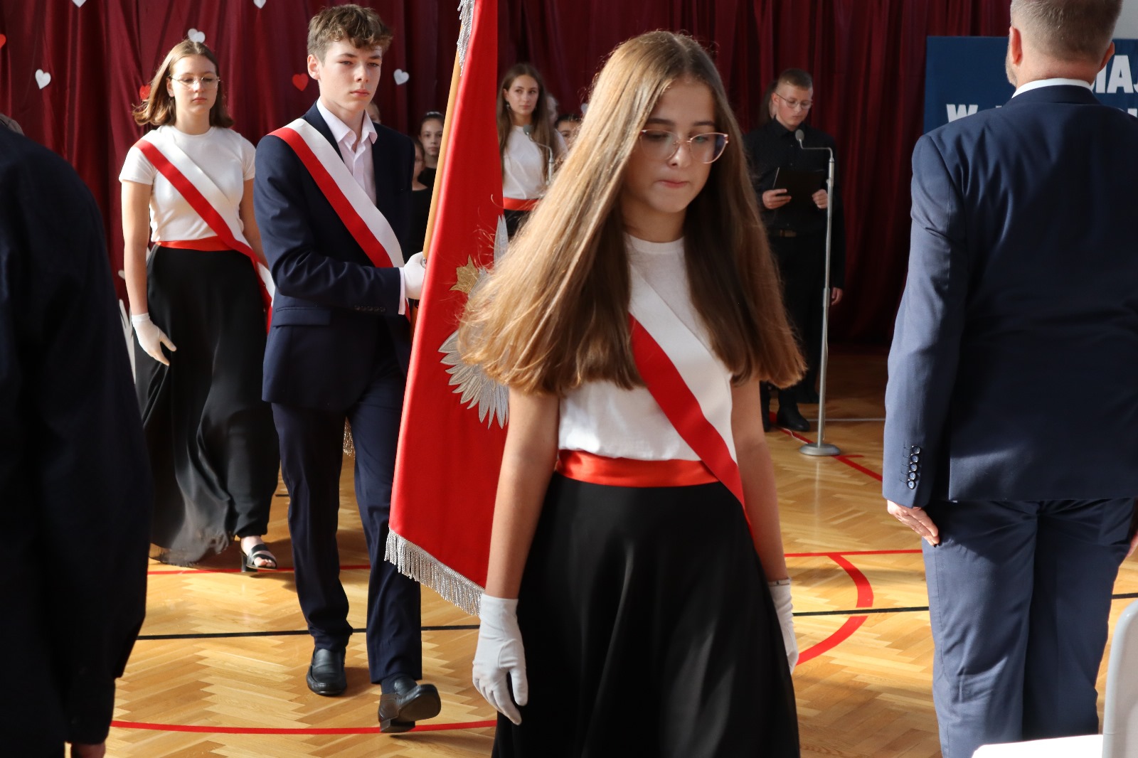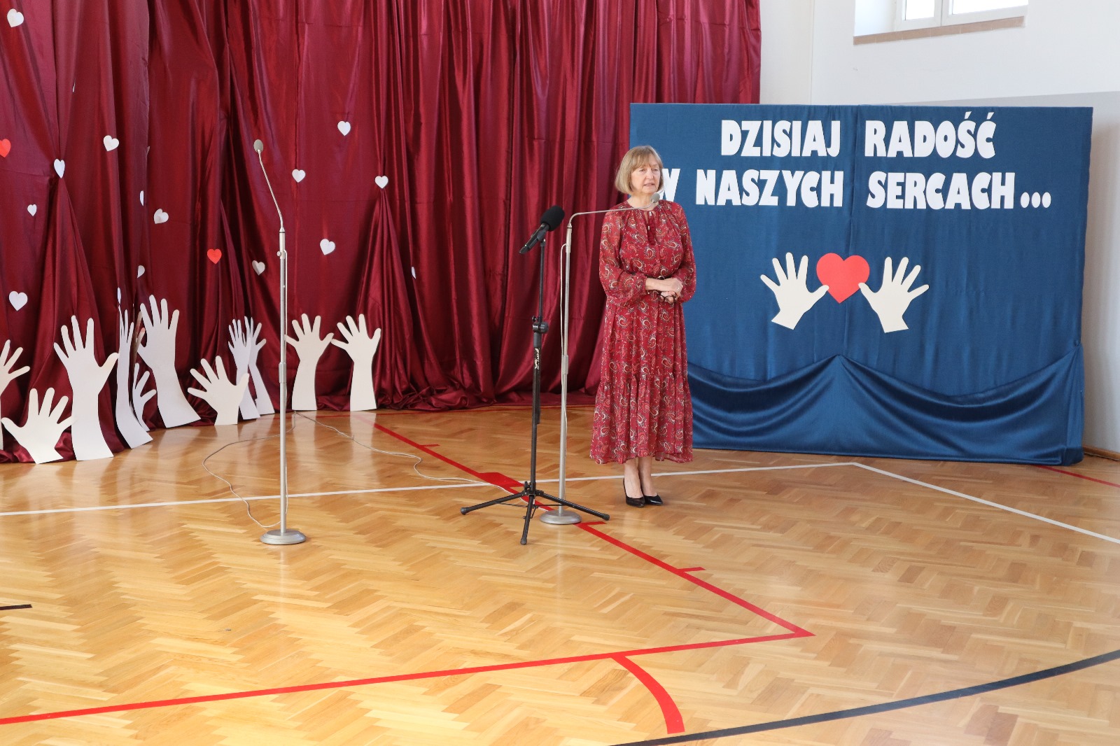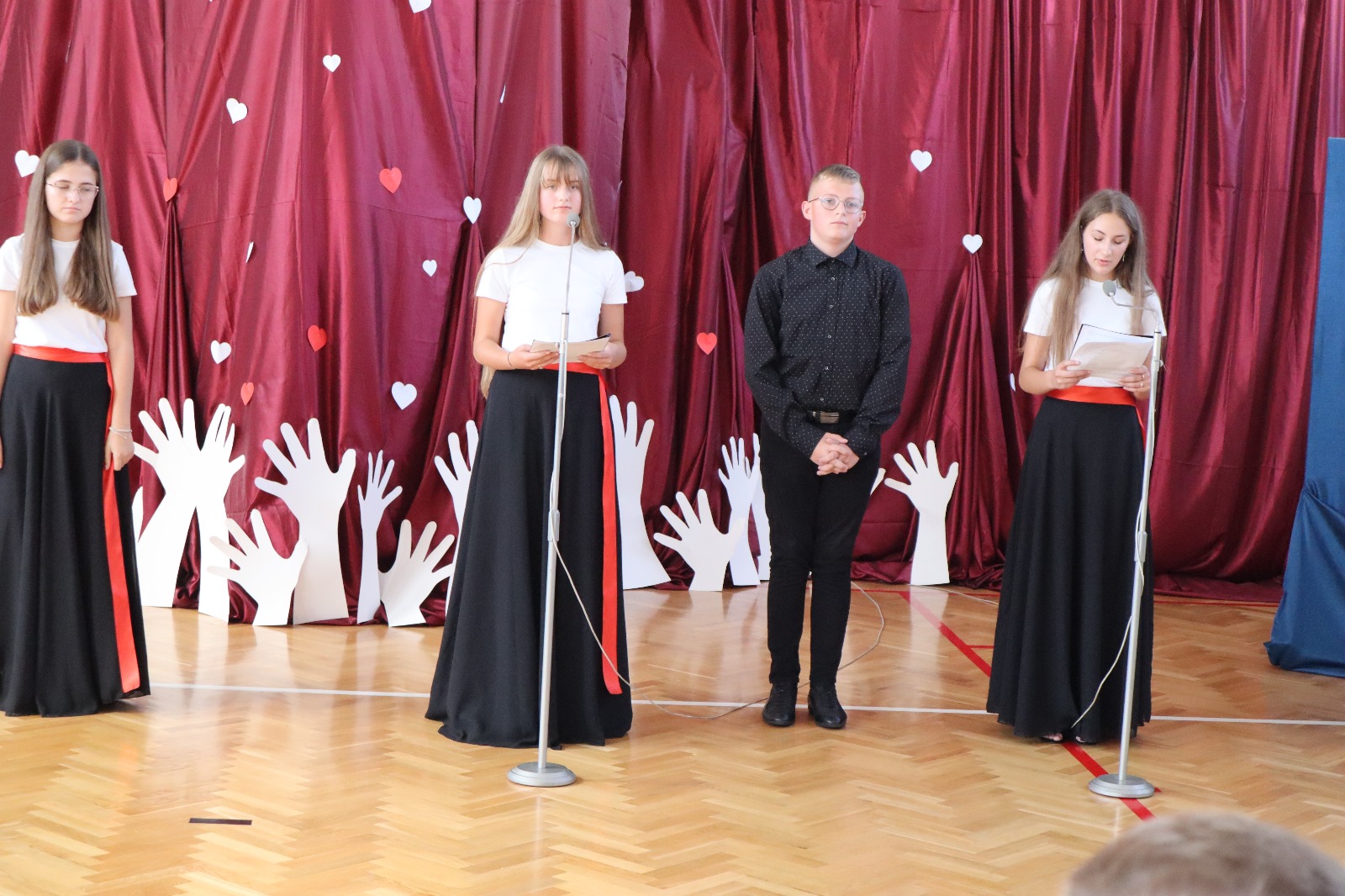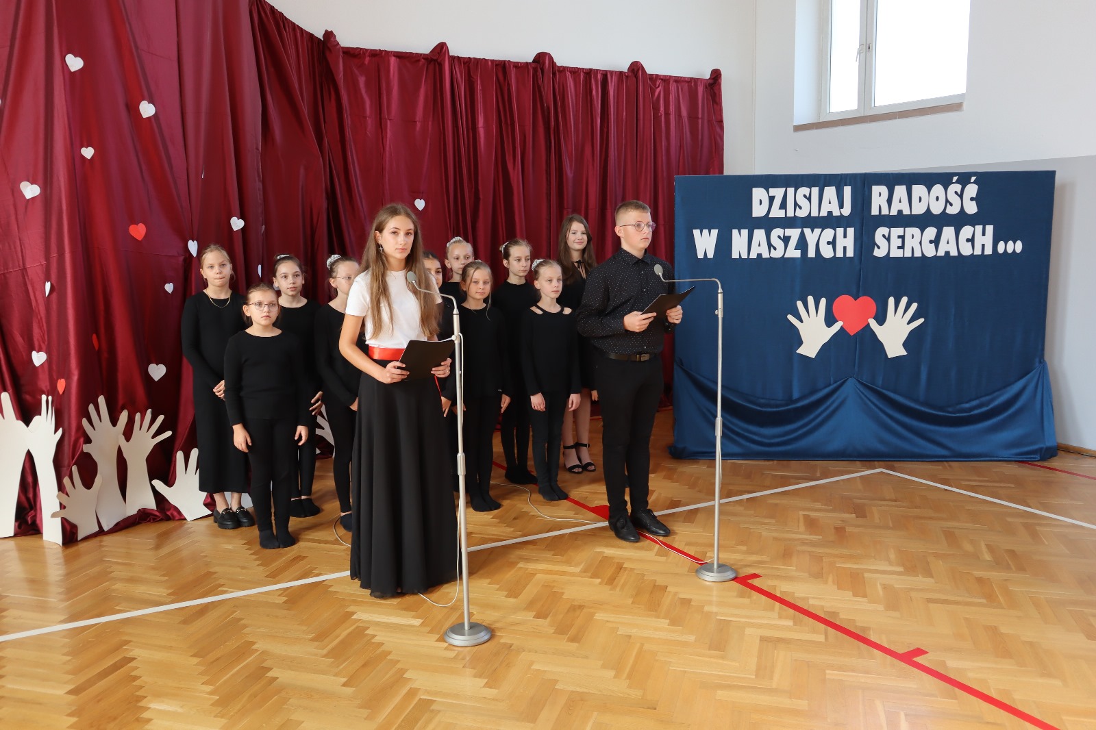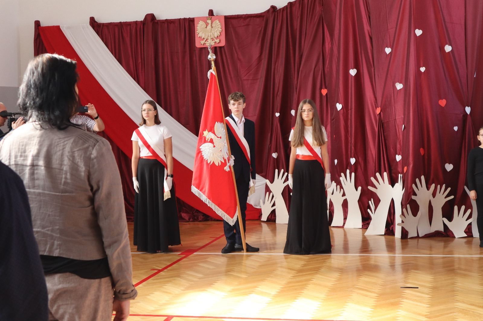 Następnie wszyscy przeszli do sali gimnastycznej. Po odśpiewaniu hymnu państwowego i okolicznościowych przemówieniach, głos zabrali uczniowie. Były wiersze, piosenki, taniec z flagami, pokazy slajdów, występ akrobatyczny. Dzięki temu zgromadzeni mogli się przekonać, w jaki sposób uczniowie ze Srocka realizują swoje pasje i uzdolnienia.