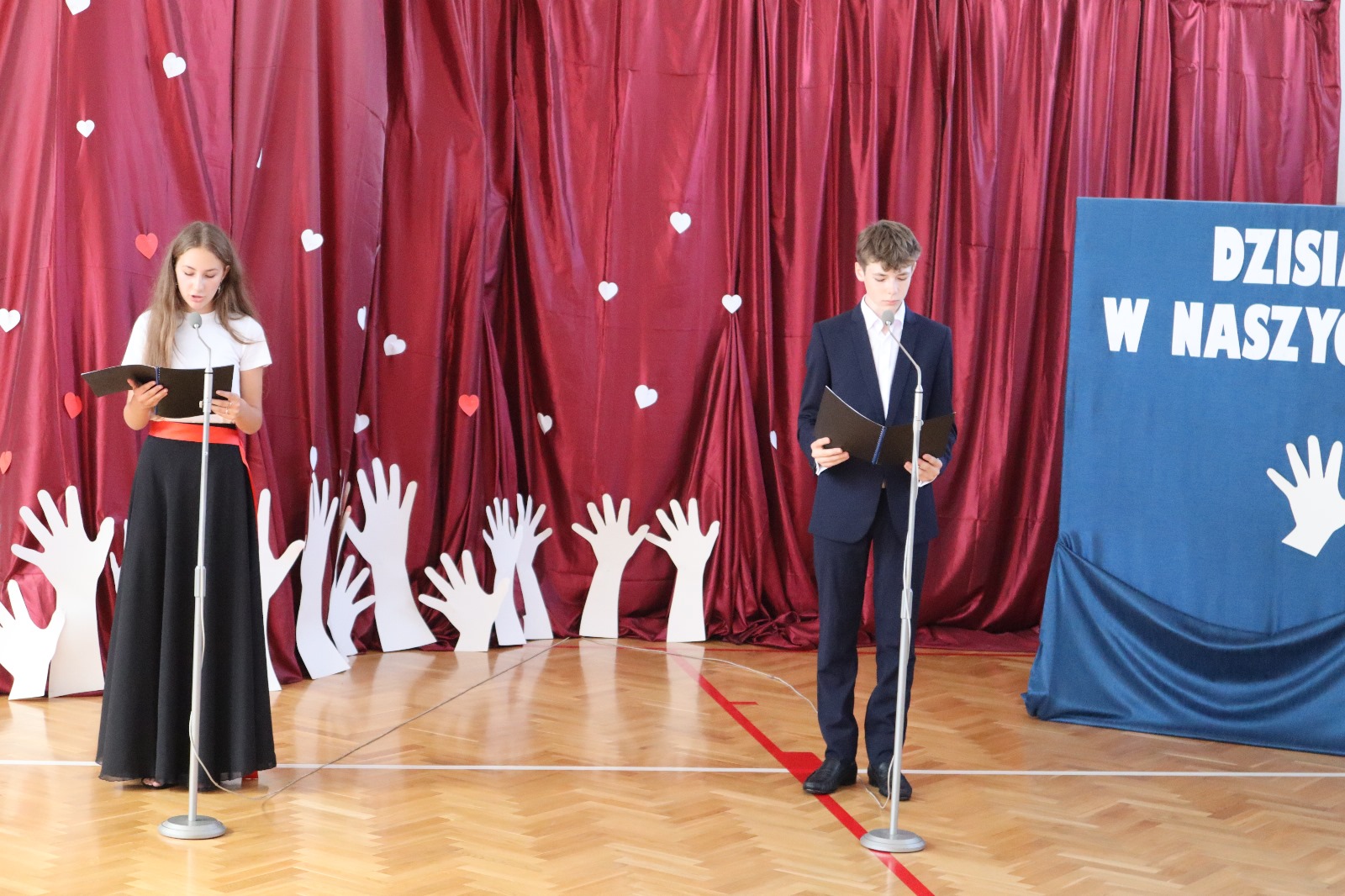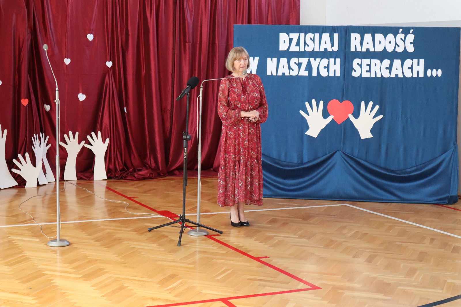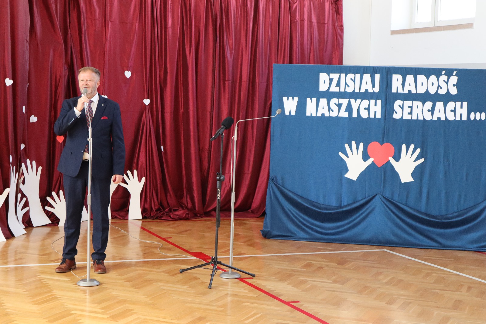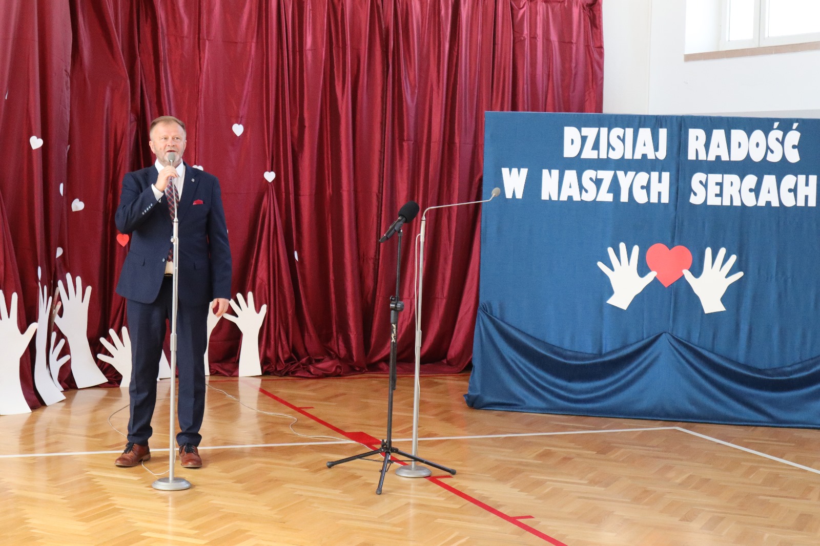 Następnie wszyscy przeszli do sali gimnastycznej. Po odśpiewaniu hymnu państwowego i okolicznościowych przemówieniach, głos zabrali uczniowie. Były wiersze, piosenki, taniec z flagami, pokazy slajdów, występ akrobatyczny. Dzięki temu zgromadzeni mogli się przekonać, w jaki sposób uczniowie ze Srocka realizują swoje pasje i uzdolnienia.