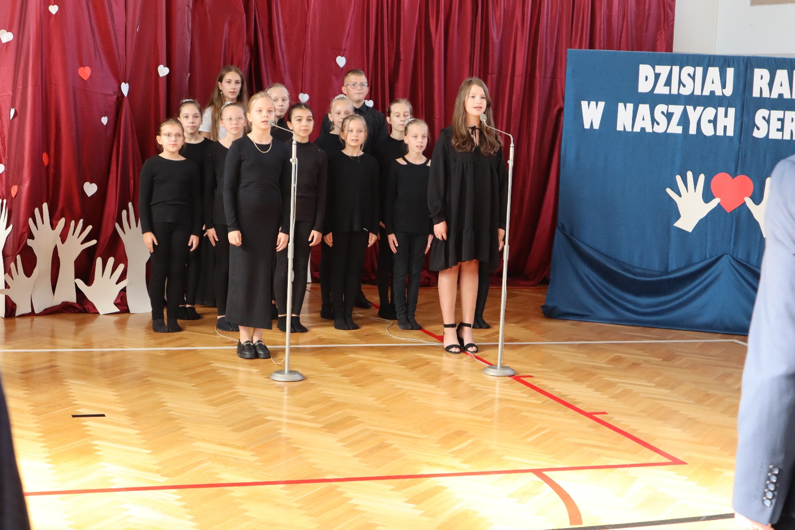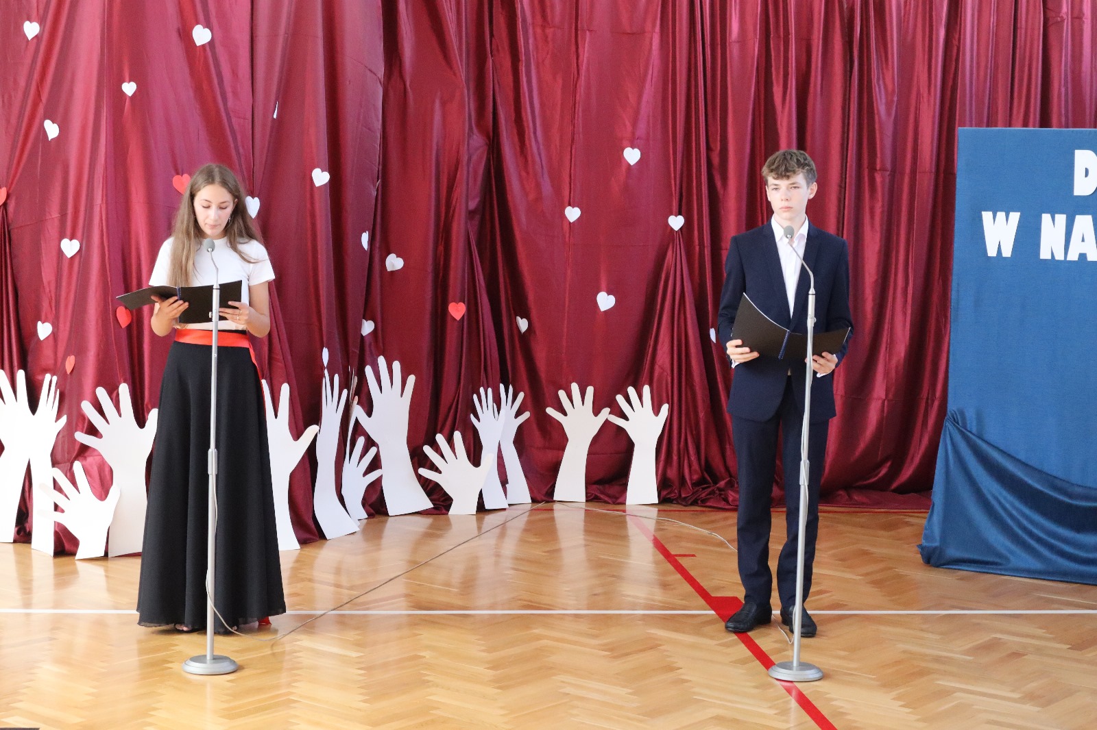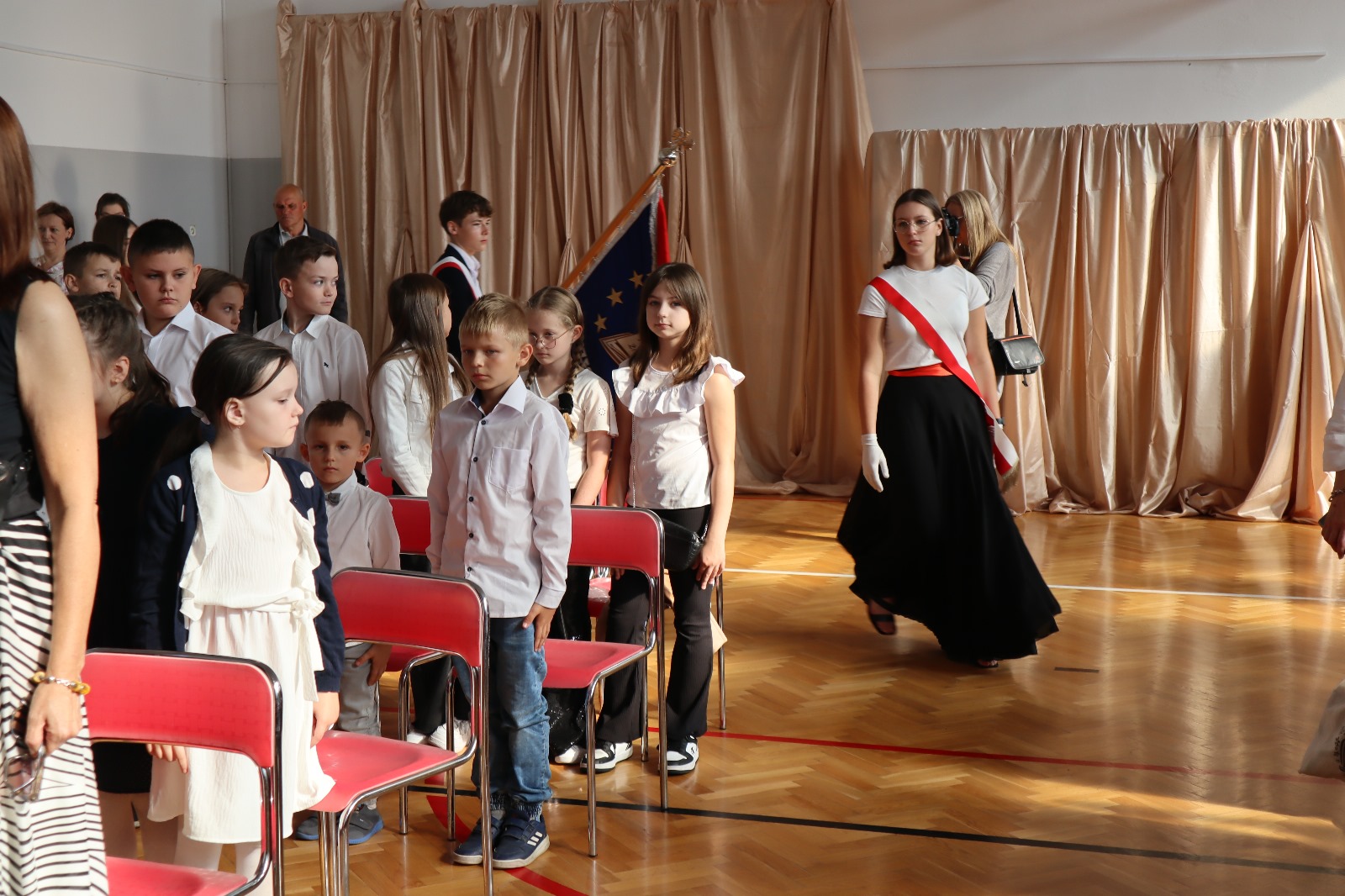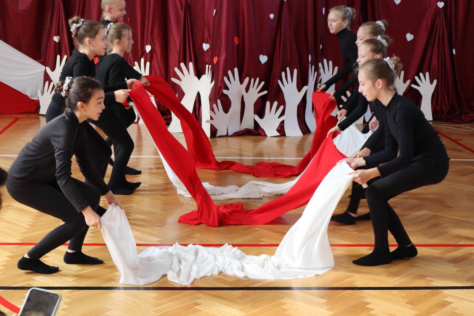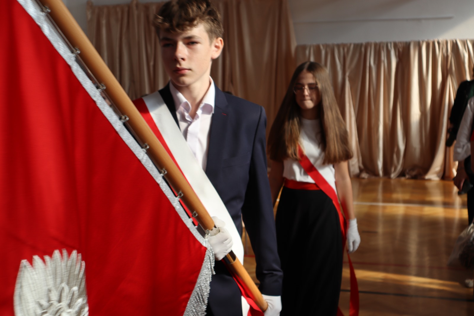 Następnie wszyscy przeszli do sali gimnastycznej. Po odśpiewaniu hymnu państwowego i okolicznościowych przemówieniach, głos zabrali uczniowie. Były wiersze, piosenki, taniec z flagami, pokazy slajdów, występ akrobatyczny. Dzięki temu zgromadzeni mogli się przekonać, w jaki sposób uczniowie ze Srocka realizują swoje pasje i uzdolnienia.