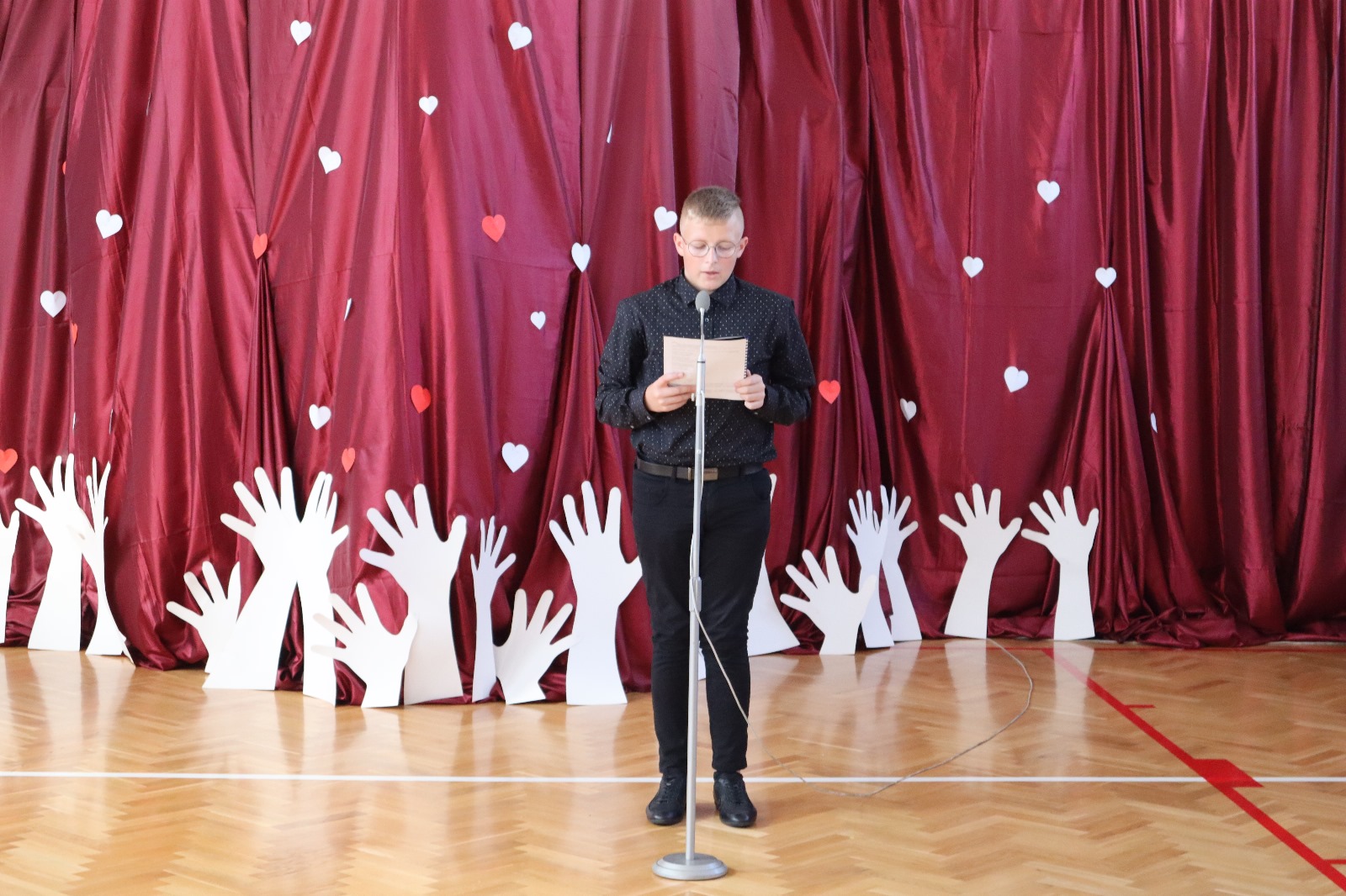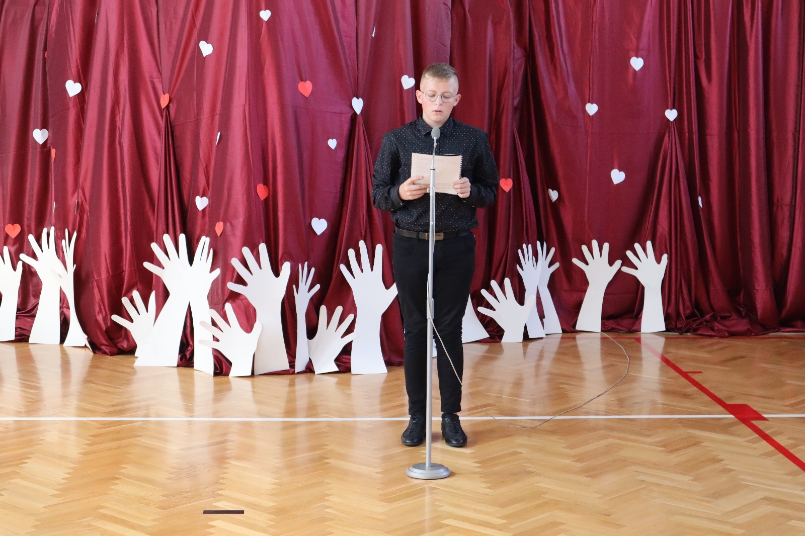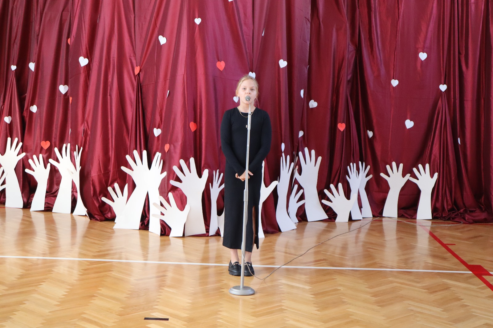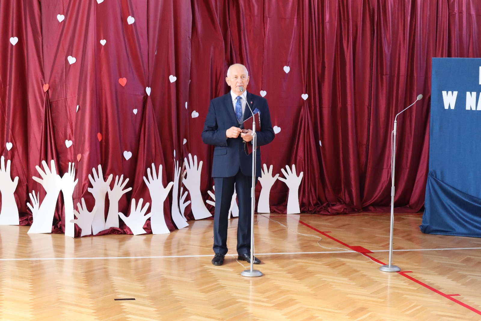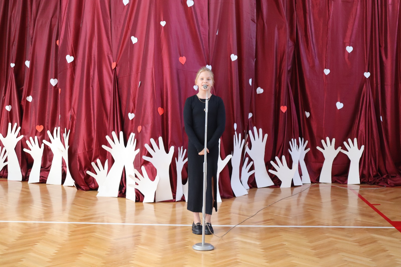 Następnie wszyscy przeszli do sali gimnastycznej. Po odśpiewaniu hymnu państwowego i okolicznościowych przemówieniach, głos zabrali uczniowie. Były wiersze, piosenki, taniec z flagami, pokazy slajdów, występ akrobatyczny. Dzięki temu zgromadzeni mogli się przekonać, w jaki sposób uczniowie ze Srocka realizują swoje pasje i uzdolnienia.