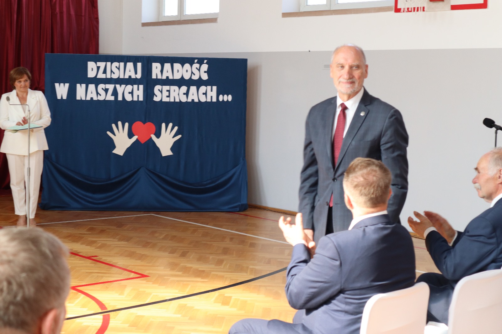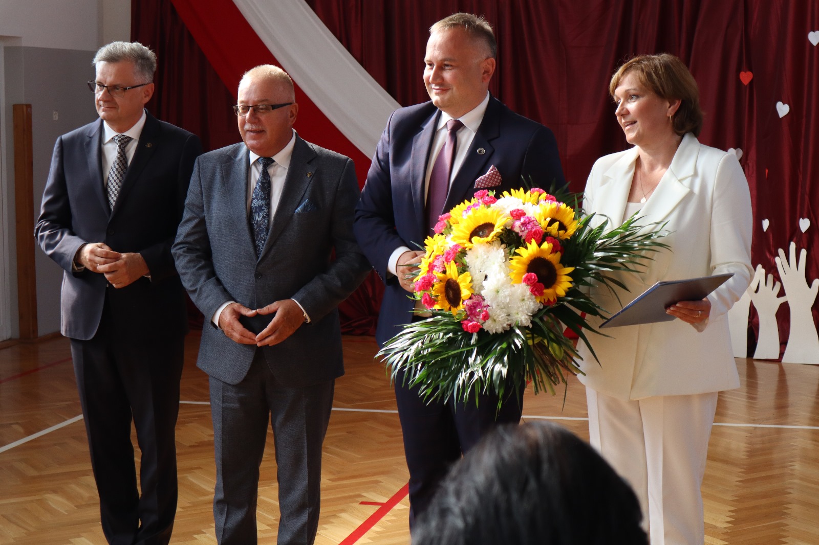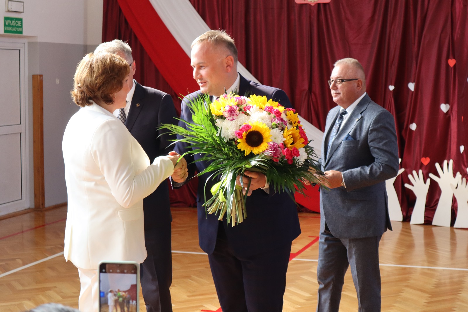 Po odśpiewaniu hymnu, wszystkich zebranych serdecznie powitali gospodarze uroczystości - Marceli Piekarek Wójt Gminy oraz Iwona Pałygiewicz dyrektor szkoły. Następnie, zaproszeni goście wygłosili okolicznościowe przemówienia; ich wypowiedzi przepełnione były pięknymi słowami na temat wartości, właściwego wychowania młodzieży, możliwości uczniów, rozwijania pasji, historii oraz przyszłości. Były też życzenia, kwiaty, gratulacje, prezenty.