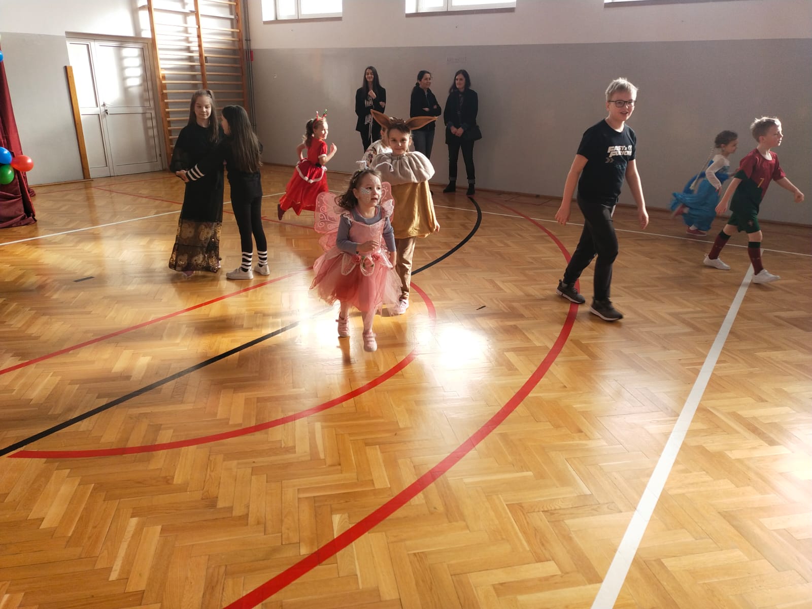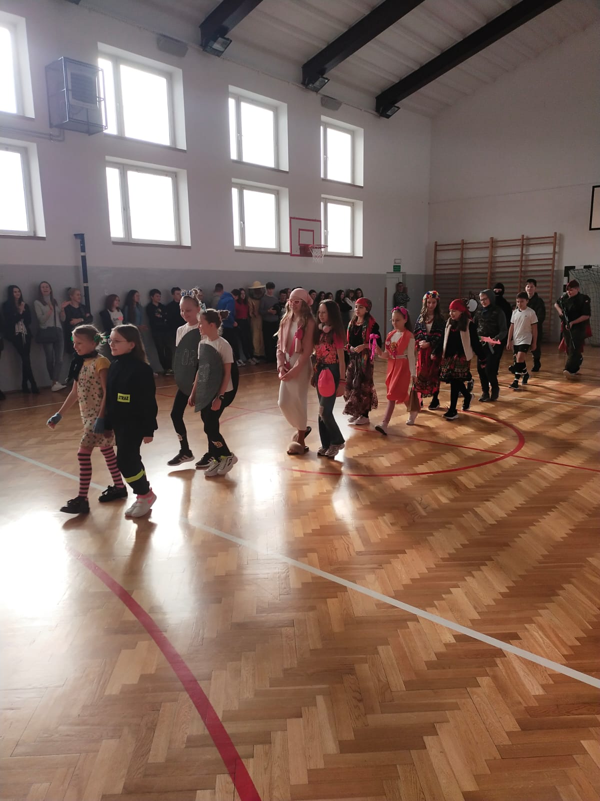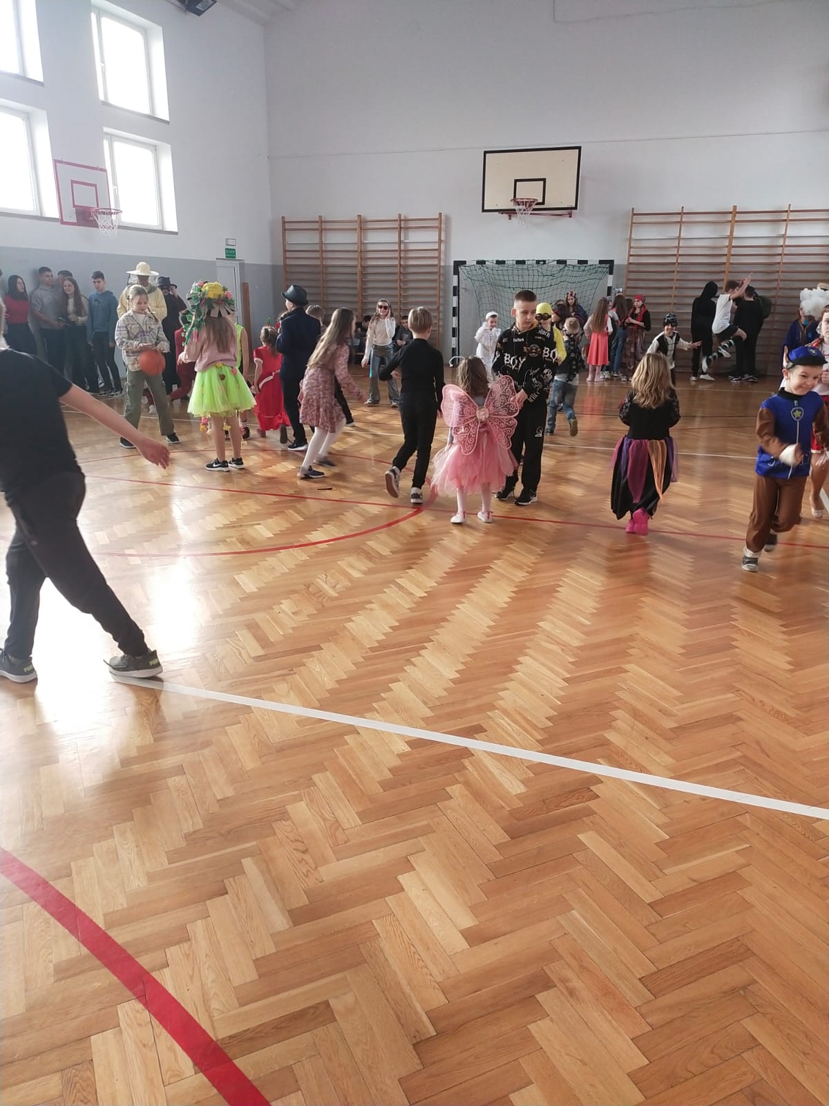 W sali gimnastycznej odbyła się szkolna parada przebierańców, podczas której rozstrzygnięto konkurs na najbardziej kreatywny strój karnawałowy. Podczas obrad JURY młodzież bawiła się wyśmienicie, wyginając się śmiało w rytm najpopularniejszych utworów. W przerwie każda z klas miała też chwilę na odpoczynek i zregenerowanie sił podczas poczęstunku, który sfinansowała Rada Rodziców działająca przy naszej szkole. Dziękujemy Piekarni Trojan za przepyszne pączusie.