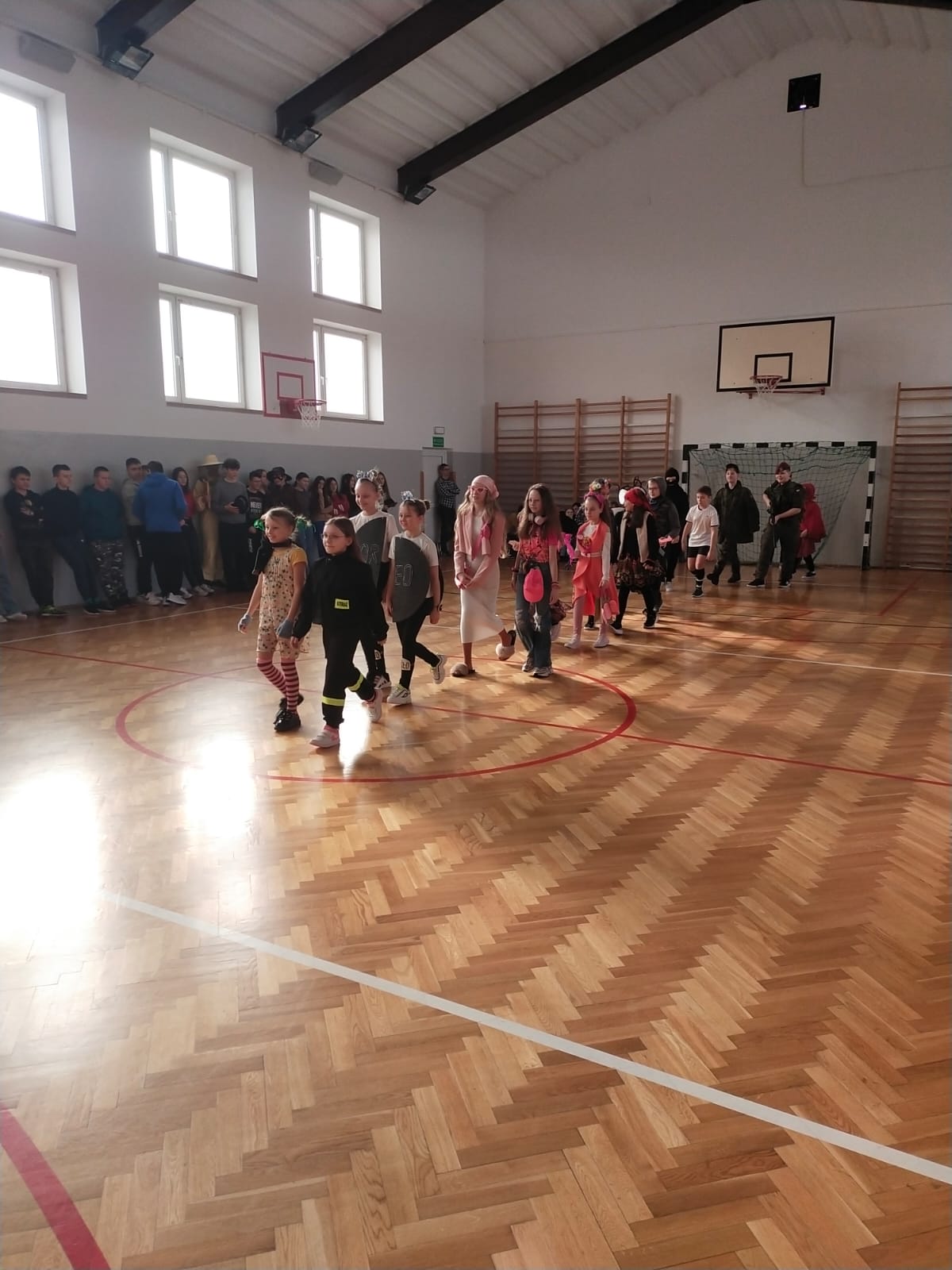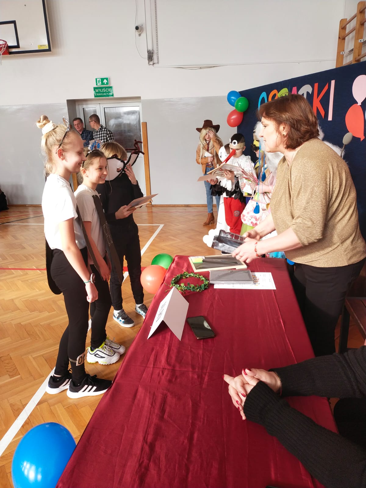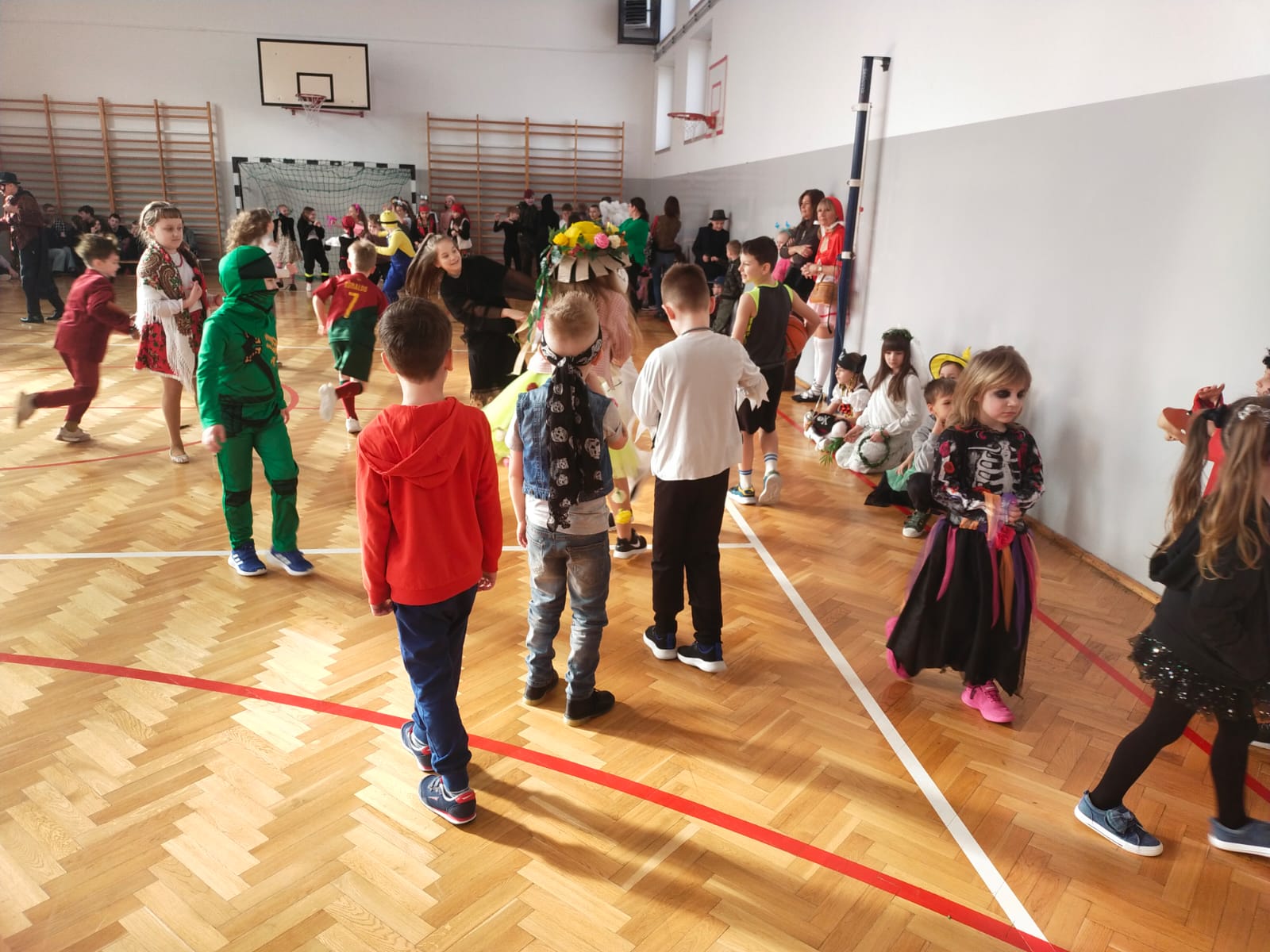 W sali gimnastycznej odbyła się szkolna parada przebierańców, podczas której rozstrzygnięto konkurs na najbardziej kreatywny strój karnawałowy. Podczas obrad JURY młodzież bawiła się wyśmienicie, wyginając się śmiało w rytm najpopularniejszych utworów. W przerwie każda z klas miała też chwilę na odpoczynek i zregenerowanie sił podczas poczęstunku, który sfinansowała Rada Rodziców działająca przy naszej szkole. Dziękujemy Piekarni Trojan za przepyszne pączusie.