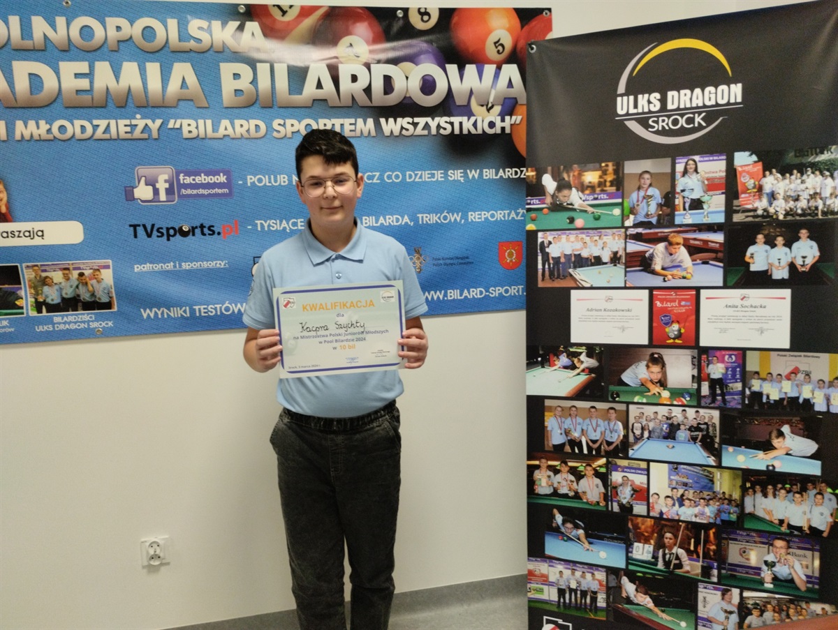 Pierwszy turniej bilardowy organizowany w Srocku zakończył się sukcesem gospodarzy! Byliśmy gospodarzem turnieju eliminacyjnego do Mistrzostw Polski Juniorów Młodszych w Pool Bilardzie 2024 w odmiany 9 bil oraz 10 bil. W "dziesiątkę" kwalifikację otrzymywało trzech najlepszych bilardzistów. Wśród nich, po świetnym występie znalazł się nasz zawodnik, uczeń klasy VII, Kacper Szychta! Oprócz Kacpra awansowali również: Adrian Lewandowski (Promyk Czerniewice) oraz Filip Kubiak (Joker 13 Tomaszów Mazowiecki). W "dziewiątkę" było trudniej, ponieważ awansował tylko zwycięzca, a nim okazał się także nasz zawodnik, uczeń klasy VI, Bartosz Michalak, który pokonał w finale Jakuba Statkiewicza z Baribala Lubin.