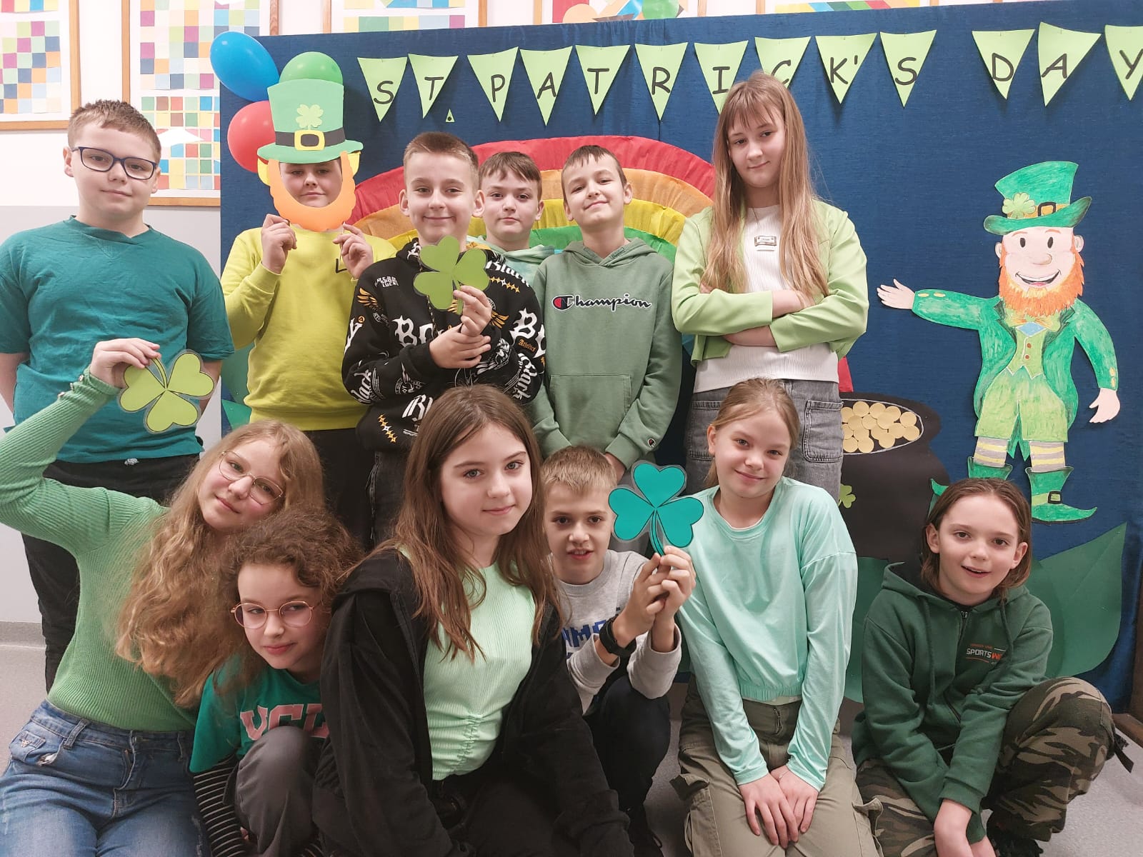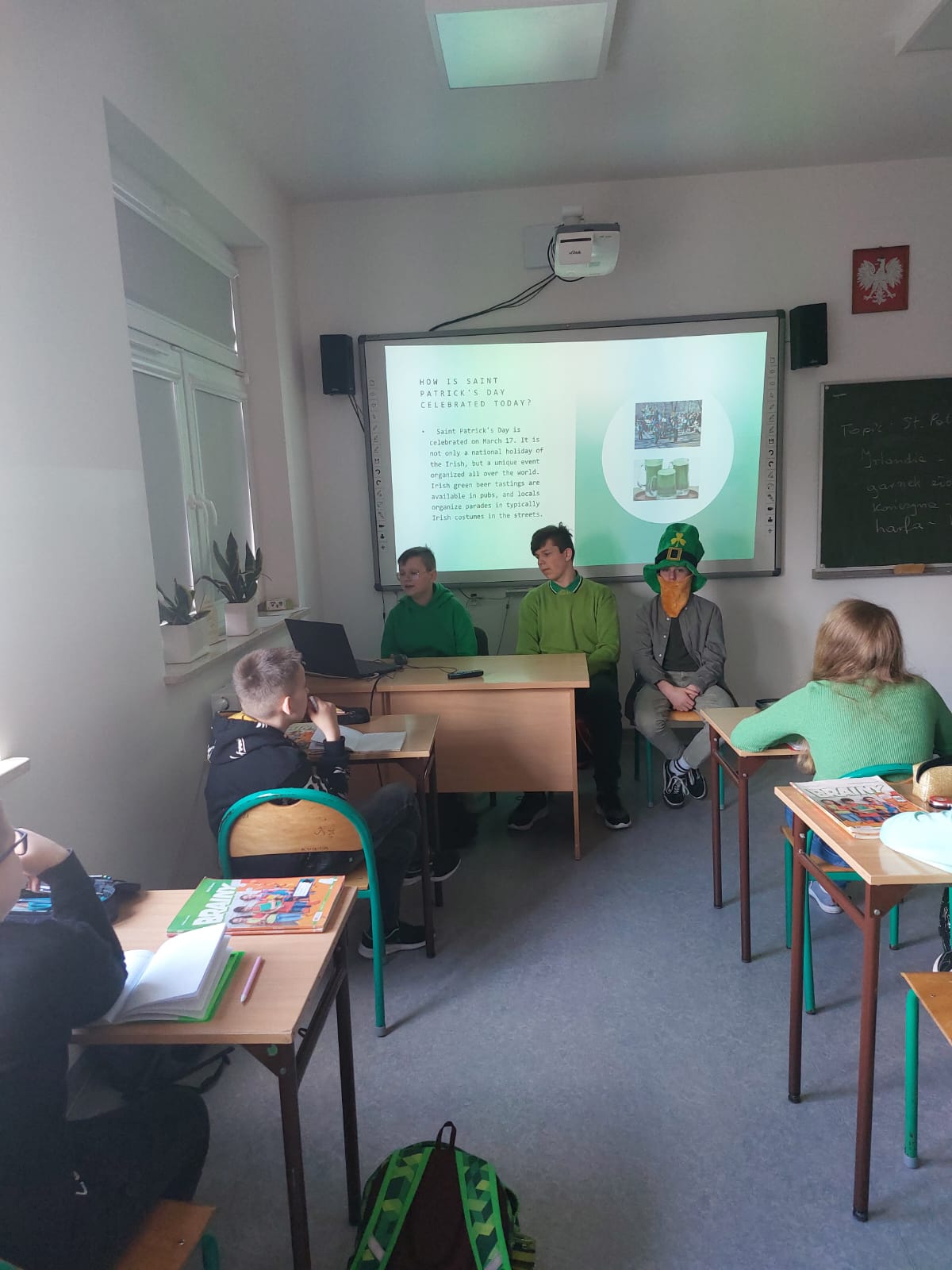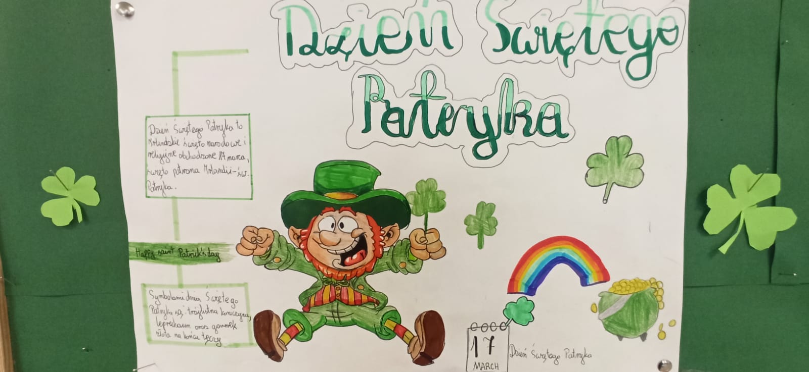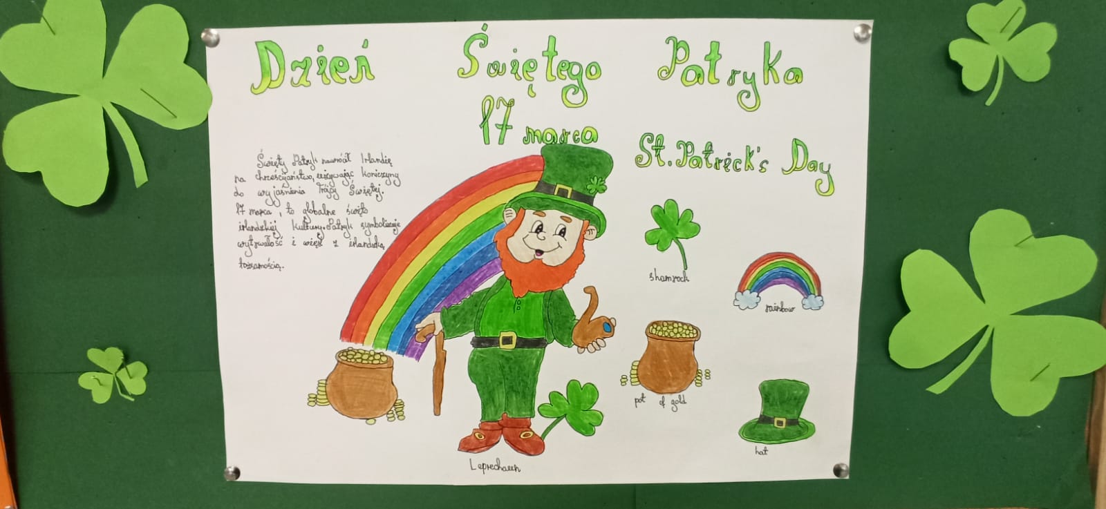Dzisiaj w naszej szkole dominował kolor zielony. Jest to motyw irlandzkiego święta obchodzonego corocznie w dniu 17 marca – Dnia Świętego Patryka. Uczniowie klas 4-8 wykonali piękne plakaty o tradycjach związanych z tym świętem oraz o cudownej szmaragdowej wyspie jak potocznie nazywana jest Irlandia. Ponadto osoby z klasy 8 – Maja Trojan, Oliwier Żerek, Dominik Florczyk oraz Mateusz Krawczyk - przedstawiły swoim rówieśnikom oraz młodszym kolegom przygotowane przez siebie prezentacje. Nie zabrakło również Leprikona – Adama Oleksiewicza, który starał się bacznie pilnować swojego garnka ze złotem. Każda klasa miała okazję sprawdzić swoją wiedzę o św. Patryku oraz o Irlandii, rozwiązując różne zagadki oraz quizy Kahoot.
