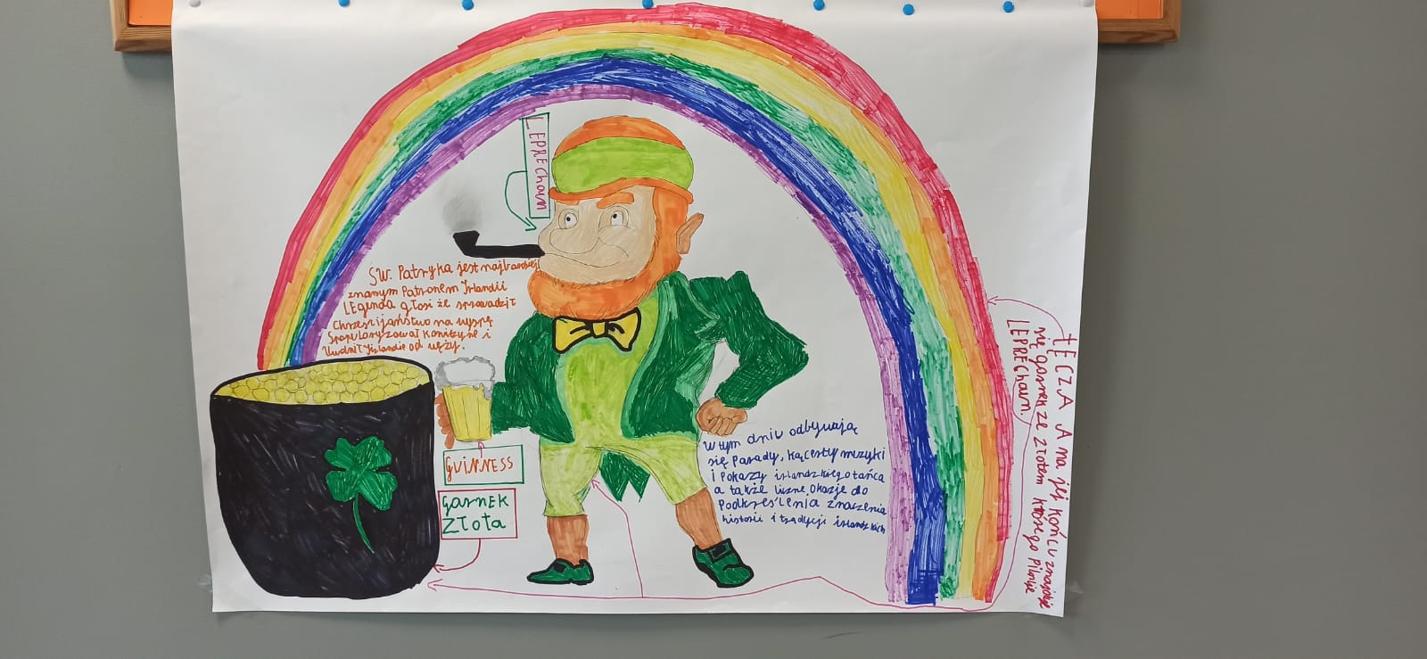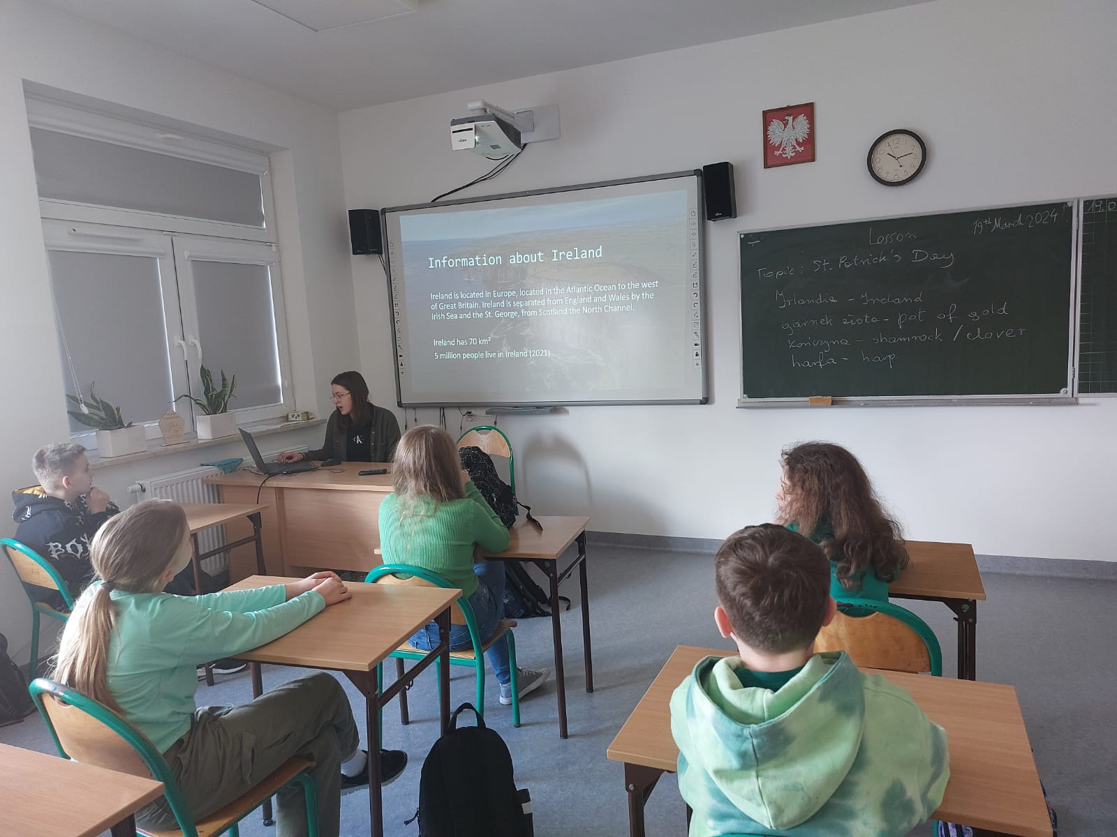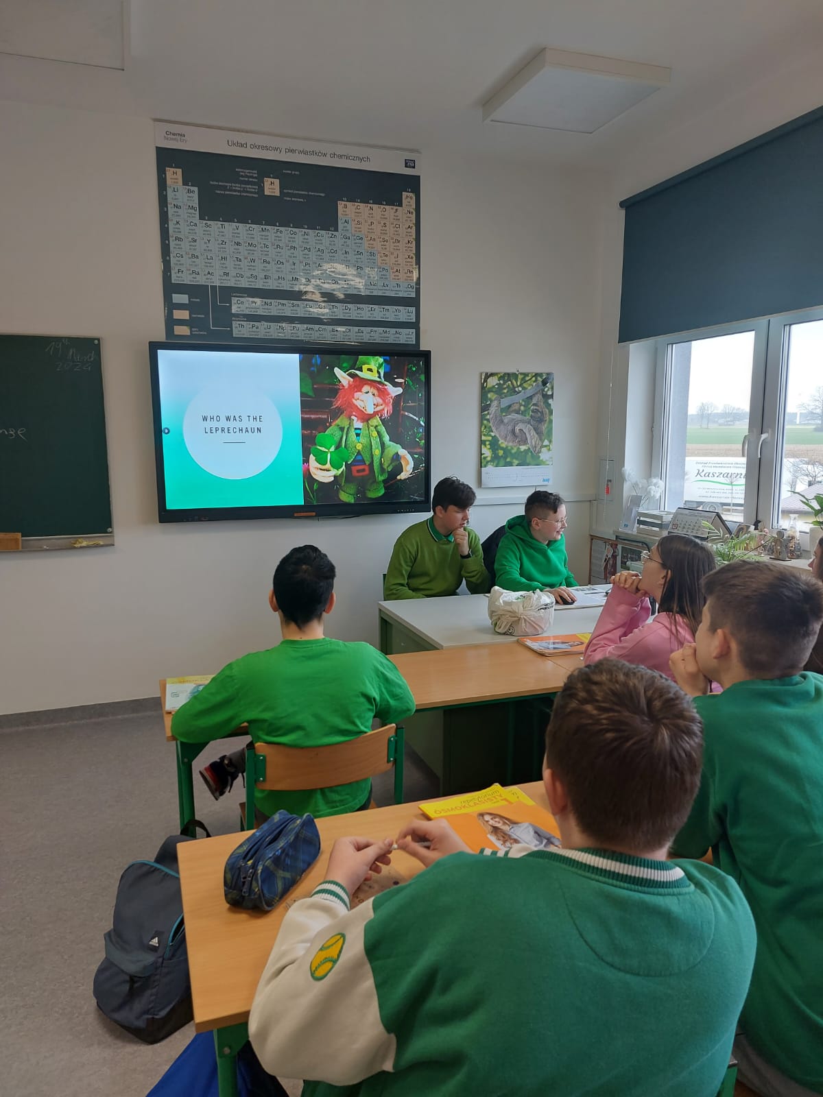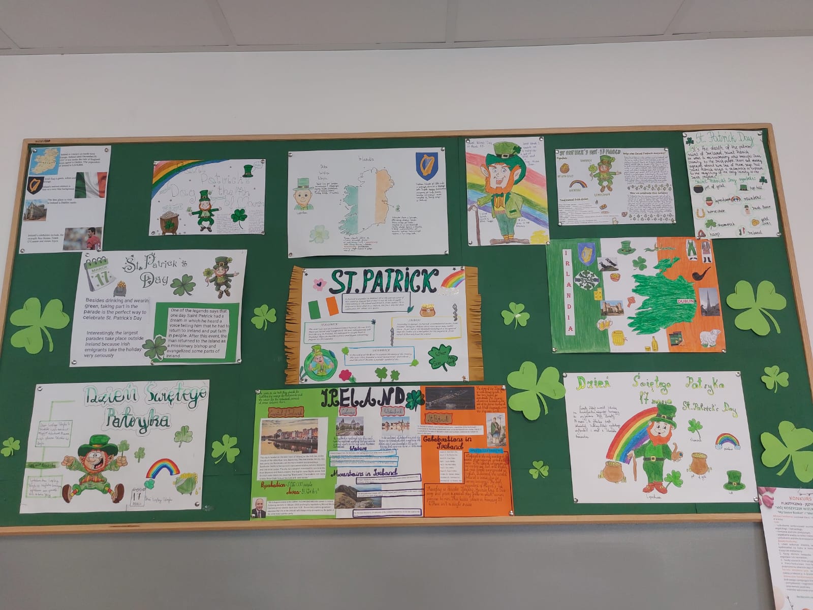 Dzisiaj w naszej szkole dominował kolor zielony. Jest to motyw irlandzkiego święta obchodzonego corocznie w dniu 17 marca – Dnia Świętego Patryka. Uczniowie klas 4-8 wykonali piękne plakaty o tradycjach związanych z tym świętem oraz o cudownej szmaragdowej wyspie jak potocznie nazywana jest Irlandia. Ponadto osoby z klasy 8 – Maja Trojan, Oliwier Żerek, Dominik Florczyk oraz Mateusz Krawczyk - przedstawiły swoim rówieśnikom oraz młodszym kolegom przygotowane przez siebie prezentacje. Nie zabrakło również Leprikona – Adama Oleksiewicza, który starał się bacznie pilnować swojego garnka ze złotem. Każda klasa miała okazję sprawdzić swoją wiedzę o św. Patryku oraz o Irlandii, rozwiązując różne zagadki oraz quizy Kahoot.