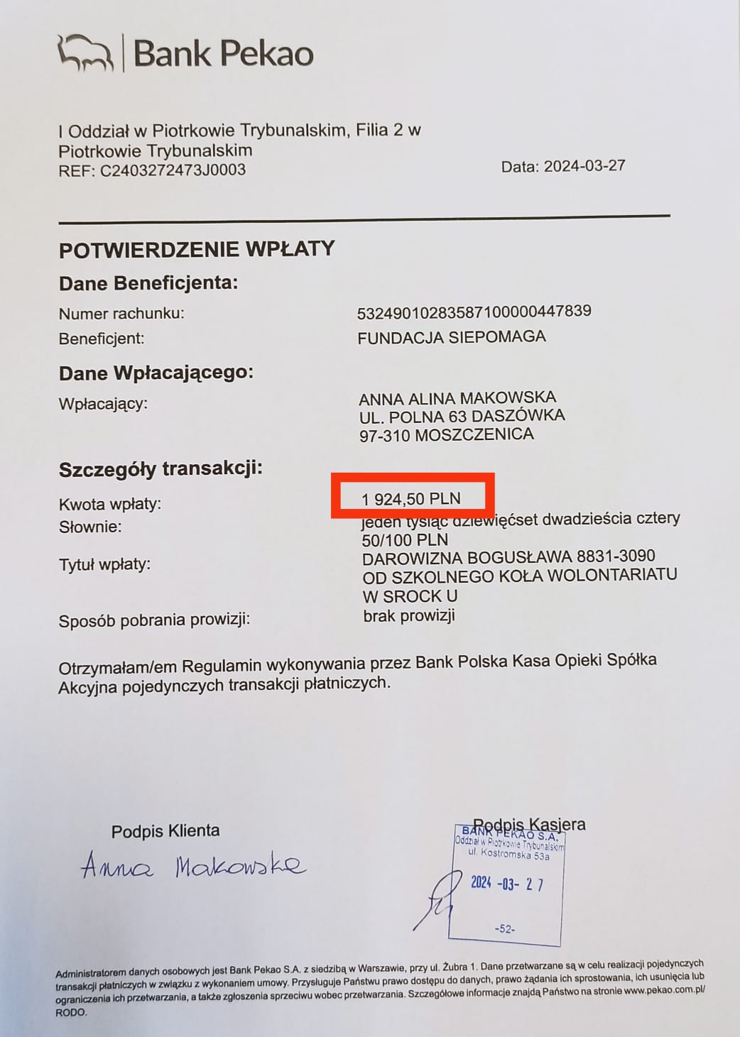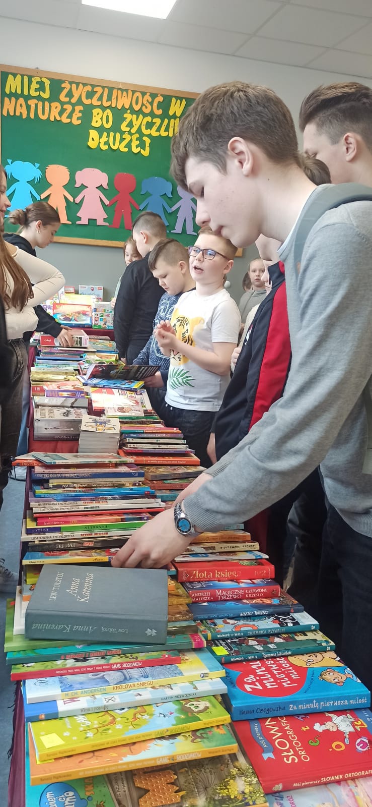 W dniach 25.03.2024 r. – 27.03.2024 r. w naszej szkole odbył się kiermasz używanych książek, pluszaków, puzzli, gier planszowych i tym podobnych rzeczy, które podarowali uczniowie na szczytny cel. Tym razem pomagaliśmy mieszkance Srocka- pani Bogusi, która wymaga kosztownej rehabilitacji, aby wrócić  do zdrowia po udarze. Udało nam się zebrać 1924,50 zł, które wpłaciliśmy na specjalne konto.