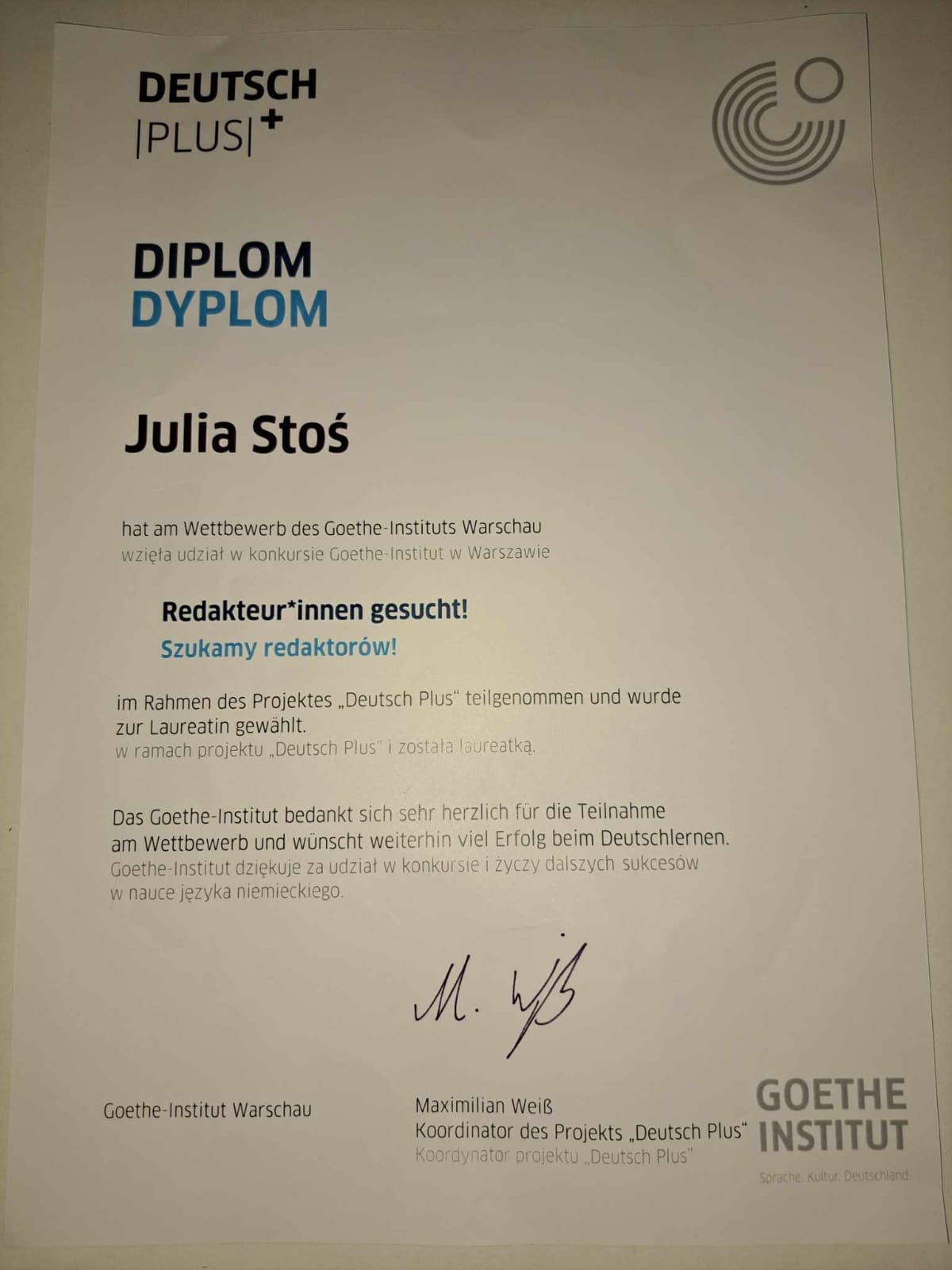 Uczennica klasy 7- Julia Stoś spróbowała swoich sił jako redaktorka, biorąc udział w piątej edycji ogólnopolskiego konkursu „Redakteur*innen gesucht! /Szukamy redaktorów/”, który został zorganizowany przez Instytut Goethego w Warszawie.  Autorami artykułów są uczniowie szkół należących do sieci „Deutsch Plus”. Nasza uczennica napisała tekst pt. „Die Macht des Geldes oder die Macht des Herzens” (Moc pieniądza czy moc serca...). W swoim tekście Julia omówiła rolę pieniędzy w życiu codziennym, podkreślając przy tym znaczenie wartości moralnych. GRATULUJEMY!