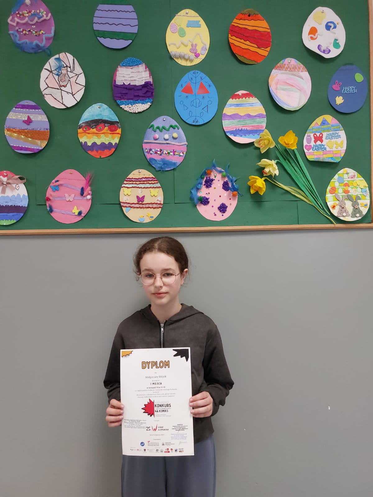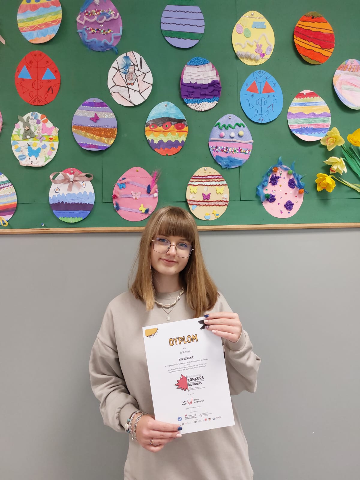 Uczennica klasy 5 Małgorzata Wójcik zajęła II miejsce, a Julia Stoś z klasy VIII została wyróżniona w II Ogólnopolskim Konkursie z Języka Niemieckiego na Komiks na temat "Osterbräuche in Deutschland, Österreich und der Schweiz - Zwyczaje wielkanocne w Niemczech, Austrii i Szwajcarii". Konkurs został zorganizowany przez Integracyjną Szkołę Podstawową nr 67 im. Janusza Korczaka w Łodzi oraz Wojewódzką Bibliotekę Publiczną w Opolu – Bibliotekę Austriacką. Zadanie konkursowe polegało na przygotowaniu komiksu promującego tradycje i zwyczaje wielkanocne na terenie krajów niemieckojęzycznych, a pracę należało wykonać w języku niemieckim.