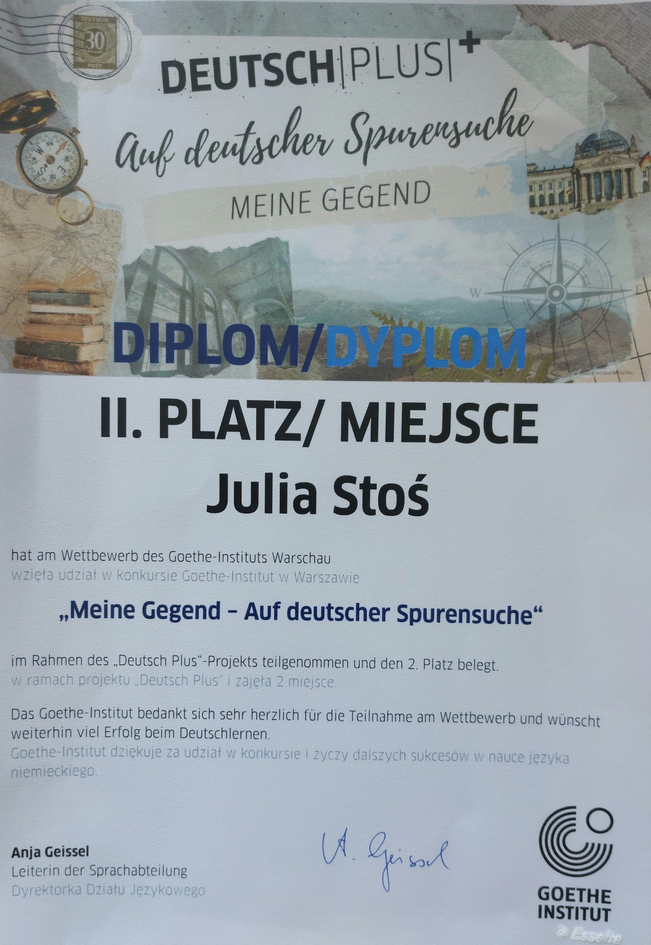 Julia Stoś z klasy 8 zajęła II miejsce w ogólnopolskim konkursie zorganizowanym przez Goethe Institut: Meine Gegend - auf deutscher Spurensuche. Zadanie konkursowe polegało na znalezieniu śladów niemieckiej historii lub języka w swojej okolicy, sfotografowania ich, opisania, stworzenia kolażu, lapbooka lub prezentacji multimedialnej. W pracy należało uzasadnić wybór tematu i uwzględnić poszukiwania historyczne. Julia opracowała prezentację pt. Auf der Suche nach deutschen Spuren in der Nähe meiner kleinen Heimat - das Geheimnis des deutschen Helden. W swojej pracy uczennica opisała los niemieckiego żołnierza, który poświęcił życie stając w obronie skazanych Polaków.